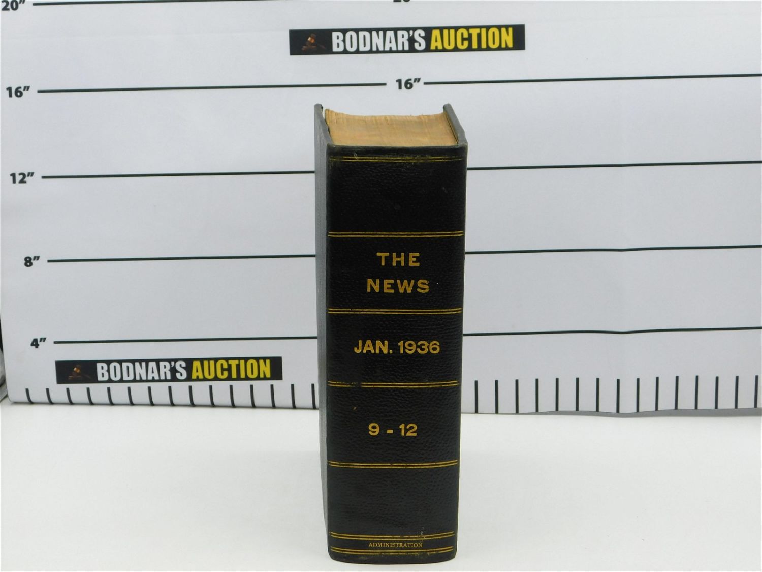 Large leather bound book of The Daily News from January 9 -12, 1936. Bound in black leather with gold lettering. It is a large book with what appears to be several publications of the paper from those 4 days. Measures approx. 15 3/4" tall x 12" wide x 5 1/4" deep. All items must be paid within 24 hours of the sale. All items are shipped USPS or UPS and will be billed separately. A $12 handling fee is added to the shipping price per lot if shipped in house. Some items or large quantity of purchases will be packed and shipped via the UPS store. Local pickups are at our South Brunswick location on Friday, Saturday and Monday ONLY! All pickups are by appointment only. Any condition issues will be listed in the description. Please read the terms for full information.