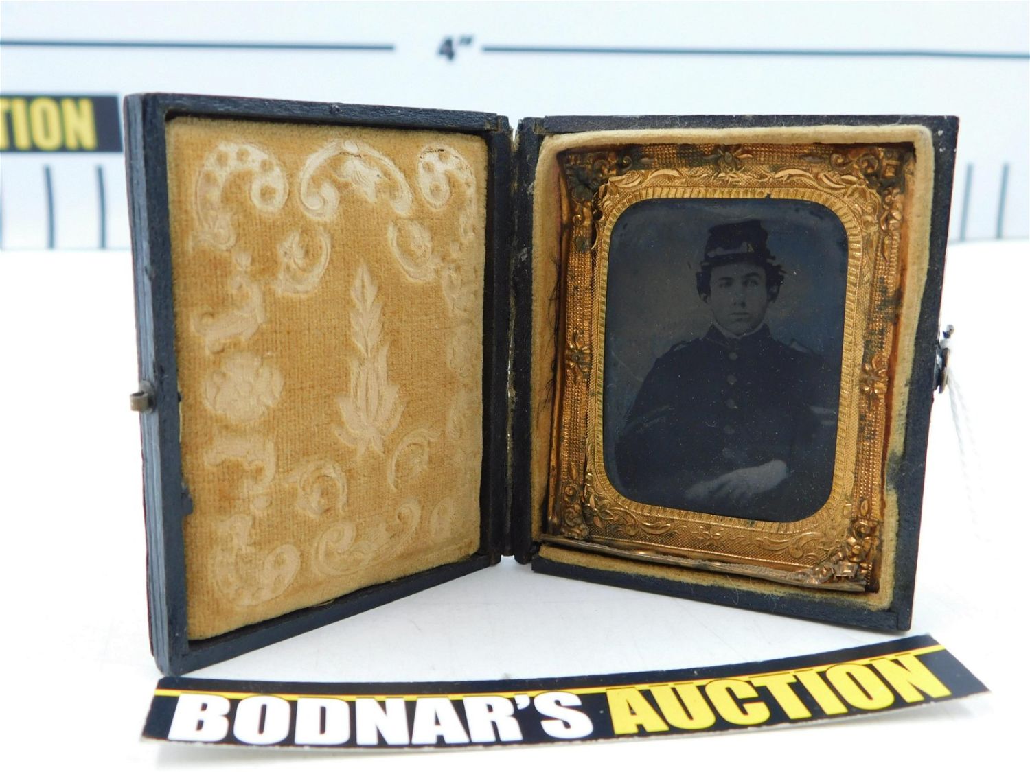 Tintype of an unidentified Union Civil War soldier. He appears to be a Corporal by his chevrons but has no other identifying marks as to what unit he belonged to. Is inside a case that has some separation at the spine. Measures approx. 3" tall x 2 1/2" wide. All invoices must be paid within 24 hours of the sale. All items are shipped USPS or UPS and will be billed separately. A $12 handling fee is added to the shipping price per lot if shipped in house. Some items or large quantity of purchases will be packed and shipped via the UPS store. Local pickups are at our South Brunswick location on Friday, Saturday and Monday ONLY! All pickups are by appointment only. Any condition issues will be listed in the description. Please read the terms for full information.