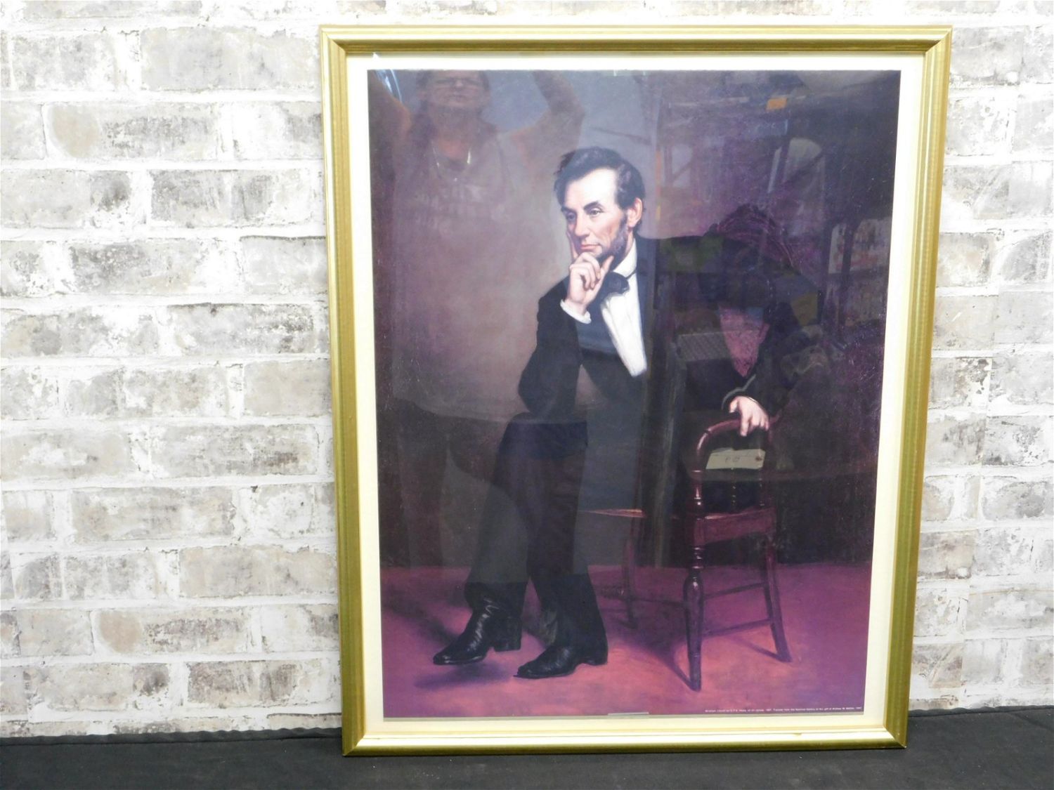 A framed poster of Abraham Lincoln. From the GPA Healy oil on canvas. Transfer by the National Gallery of Art, a gift of Andrew Mellon, 1942. The bottom of the poster has been folded to fit the frame. Frame measures approx. 29 1/2" tall x 23 1/2" wide. All invoices must be paid within 24 hours of the sale. All items are shipped USPS or UPS and will be billed separately. A $12 handling fee is added to the shipping price per lot if shipped in house. Some items or large quantity of purchases will be packed and shipped via the UPS store. Local pickups are at our South Brunswick location on Friday, Saturday and Monday ONLY! All pickups are by appointment only. Any condition issues will be listed in the description. Please read the terms for full information.