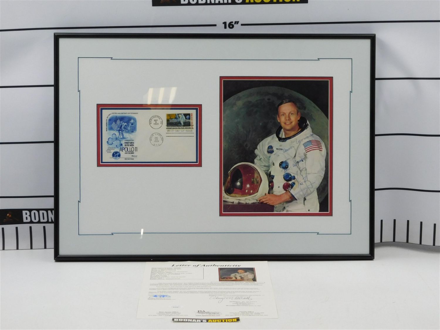 Framed and matted Neil Armstrong 8 x 10 color photo depicting Neil in his Apollo 11 space suit – signed by Armstrong in blue marker and a 1969 Apollo XI first day cover. Comes with a JSA Certificate of Authority. The frame measures approx. 16" tall x 22 1/2" wide. All invoices must be paid within 24 hours of the sale. All items are shipped USPS or UPS and will be billed separately. A $12 handling fee is added to the shipping price per lot if shipped in house. Some items or large quantity of purchases will be packed and shipped via the UPS store. Local pickups are at our South Brunswick location on Friday, Saturday and Monday ONLY! All pickups are by appointment only. Any condition issues will be listed in the description. Please read the terms for full information.