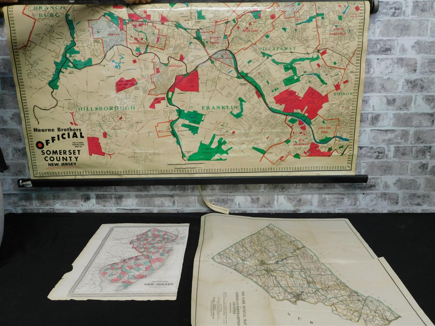 Group of 3 maps including Hearne Brothers Official Polyconic Projection Map of Somerset County, New Jersey. This is a classroom map and is very large in size. Is on the original hang bar and in very good condition with some wrinkling to the map throughout. The spring at the top to roll the map has popped. Measures approx. 54" wide. The Farm Journal Map of Lehigh and Northampton Counties, Pennsylvania. Published by Wilmer Atkinson Company, Washington Square, Philadelphia, 1914. Is a colored fold map. Has some very small tears at the folds and one longer tear at the top center crease. There are some small spots of discoloration but the paper is crisp and the map is excellent. Measures approx. 23" long x 25 1/2" wide. Johnson’s New Jersey published by AJ Johnson, New York. Unsure of the year, possibly 1868 – 1870. Has the spirograph boarder and page 37 in the top left corner. Is a hand colored map. Has some tears along the edges and some loss to the left side. There is some slight discoloration from age. Measures approx. 18" tall x 13 1/4" wide. All invoices must be paid within 24 hours of the sale. All items are shipped USPS or UPS and will be billed separately. A $12 handling fee is added to the shipping price per lot if shipped in house. Some items or large quantity of purchases will be packed and shipped via the UPS store. Local pickups are at our South Brunswick location on Friday, Saturday and Monday ONLY! All pickups are by appointment only. Any condition issues will be listed in the description. Please read the terms for full information.