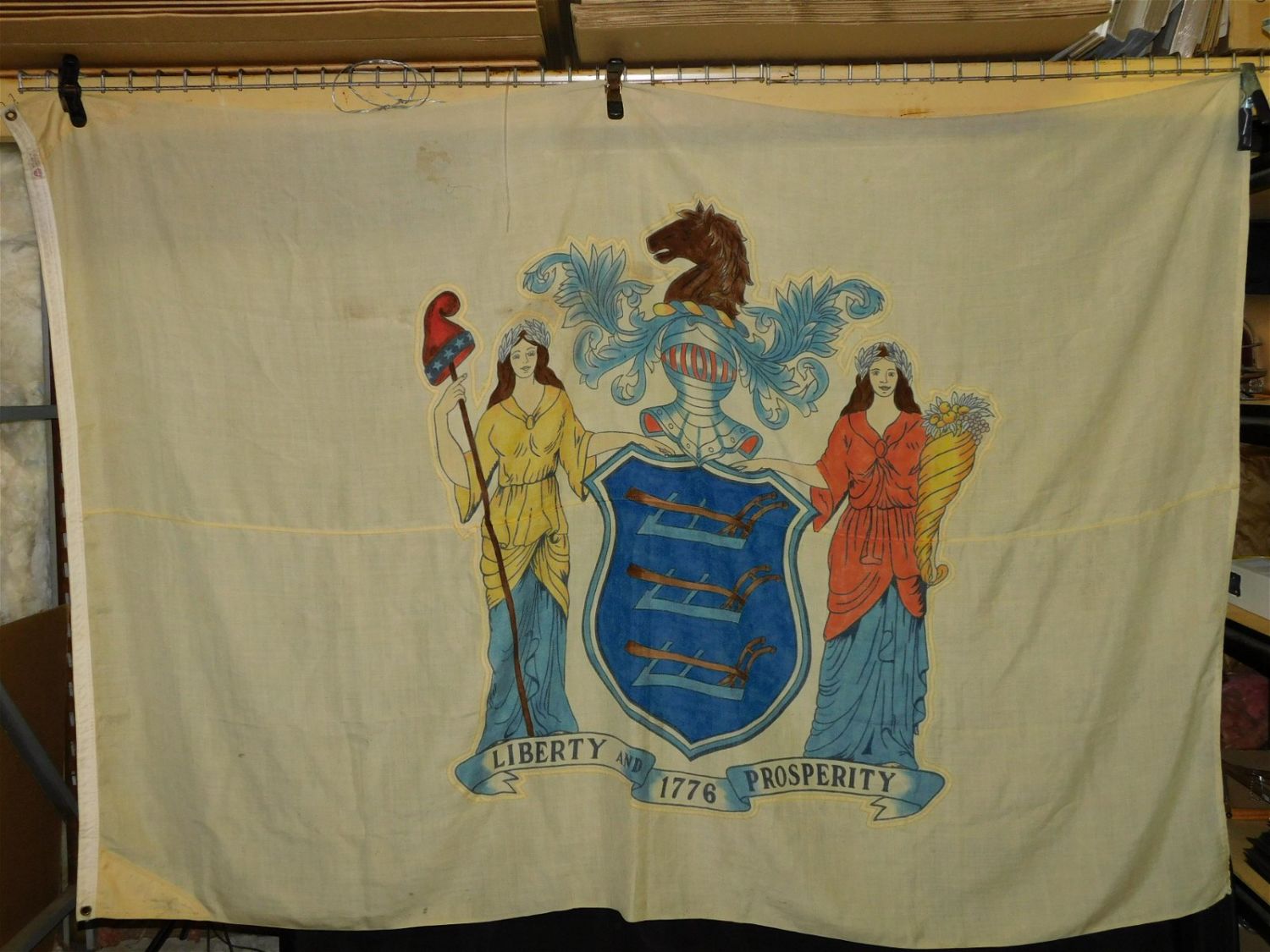Early New Jersey State Flag. The field is made up of two parts that are machine sewn down the center. Has machine embroidery around the state seal. Hand painted. The header is triple sewn with 2 grommets – one at the top and one at the bottom, and the fabric has been reinforced in these areas. The field edges are unhemmed and the fly end has been hemmed. Has some small stains throughout, some misstitching from when it was made, some small fraying to the fibers and some minor loss to the stitching around the seal. The header has been marked Kevin Stafford – Wayside NJ and has a Nylaninn Bunting label. Measures approx. 60 1/2" tall x 90" wide. All invoices must be paid within 24 hours of the sale. All items are shipped USPS or UPS and will be billed separately. A $12 handling fee is added to the shipping price per lot if shipped in house. Some items or large quantity of purchases will be packed and shipped via the UPS store. Local pickups are at our South Brunswick location on Friday, Saturday and Monday ONLY! All pickups are by appointment only. Any condition issues will be listed in the description. Please read the terms for full information.