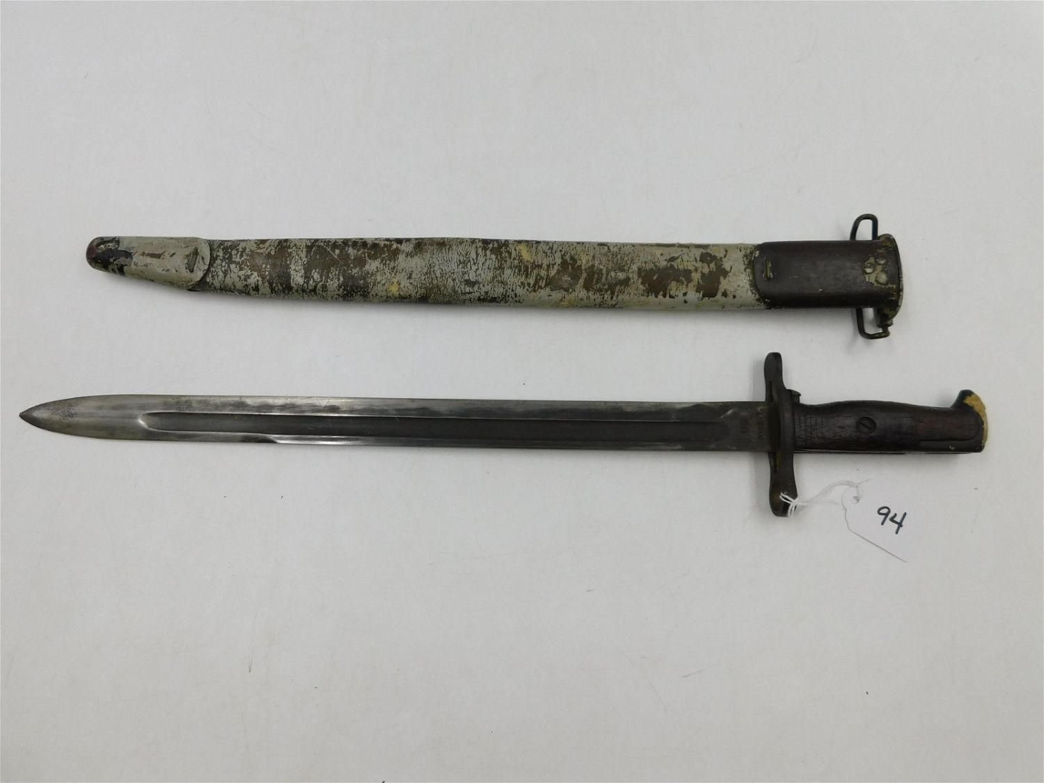 Us Rock Island Arsenal M1905 WWI bayonet. Used for the .30-06 caliber US rifle M1903. Marked on one side RIA 1918 and on the other US 359181. Has scabbard. Scabbard appears to have been painted at some point, and the paint is now coming off. The handle has what appears to be a filler for a repair to the metal. Blade measures approx. 16". All invoices must be paid within 24 hours of the sale. All items are shipped USPS or UPS and will be billed separately. A $12 handling fee is added to the shipping price per lot if shipped in house. Some items or large quantity of purchases will be packed and shipped via the UPS store. Local pickups are at our South Brunswick location on Friday, Saturday and Monday ONLY! All pickups are by appointment only. Any condition issues will be listed in the description. Please read the terms for full information.