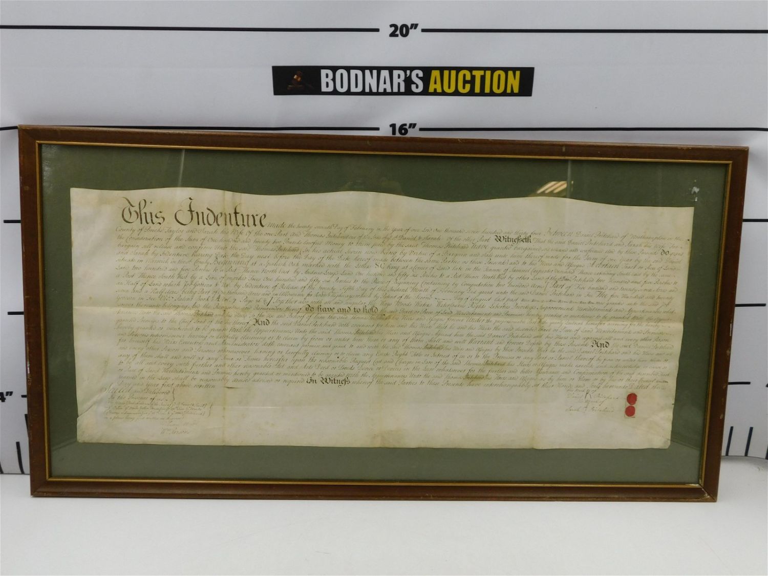 1734 Indenture between Daniel and Sarah Pritchard of Northampton, County of Bricks Taylor and their son Thomas Pritchard granting the a parcel of land for one hundred twenty two pounds. Is framed and behind glass. Has normal creasing and staining for age. The frame measures approx. 16 1/4" tall x 31 1/4" wide. All invoices must be paid within 24 hours of the sale. All items are shipped USPS or UPS and will be billed separately. A $12 handling fee is added to the shipping price per lot if shipped in house. Some items or large quantity of purchases will be packed and shipped via the UPS store. Local pickups are at our South Brunswick location on Friday, Saturday and Monday ONLY! All pickups are by appointment only. Any condition issues will be listed in the description. Please read the terms for full information.