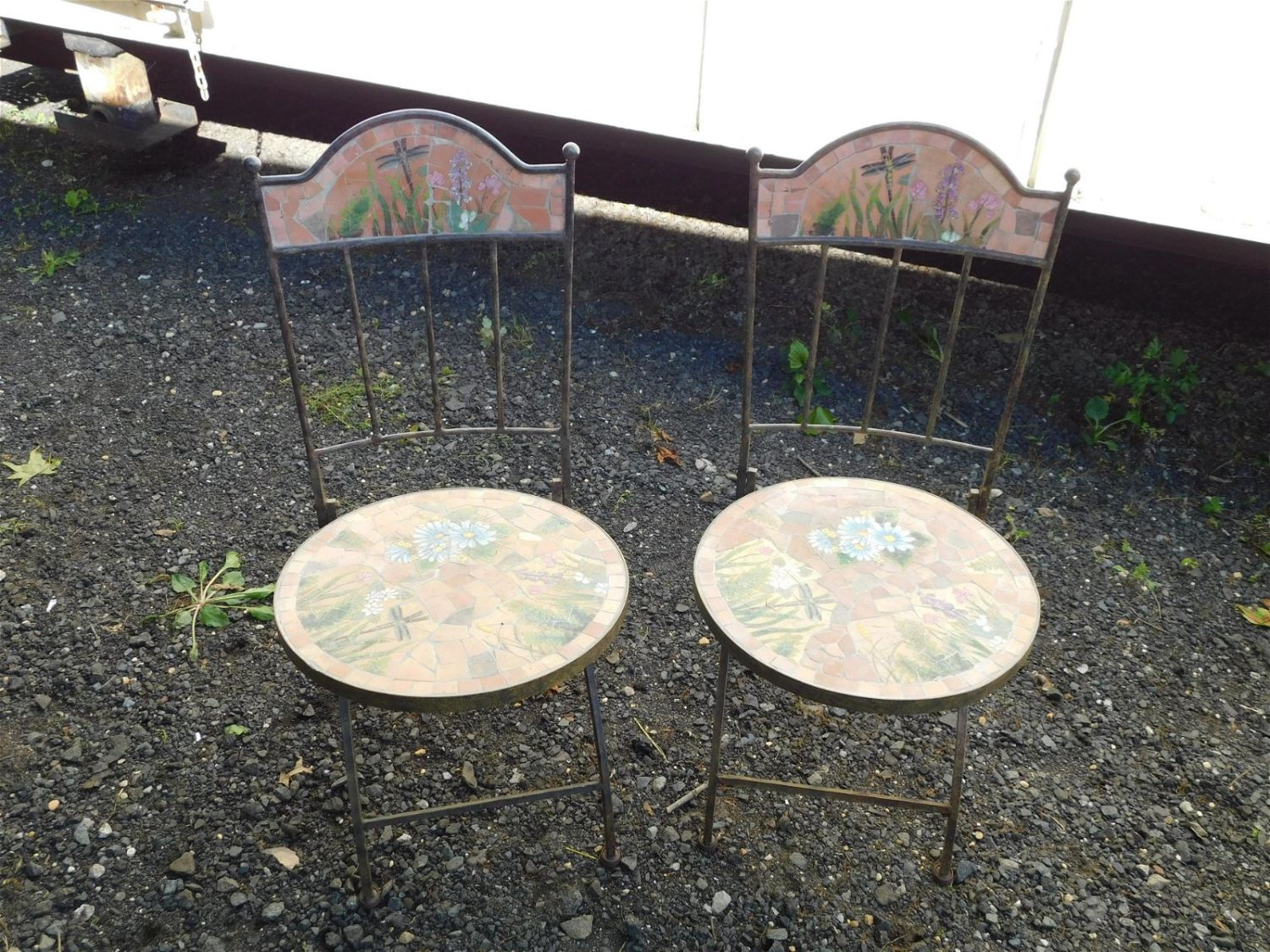 Pair of Folding Iron and Tile Chairs. Measures 35" tall x 17" wide x 18" deep. Please read the terms and conditions. This sale will be broadcast live on sale day with full descriptions of each lot being sold. All items MUST be paid for within 24 HOURS of the sale. Anyone who has not paid within 24 hours will have a dispute opened against them and will not be able to bid at future sales. We use LIVE Ship from Liveauctioneers for all shipping. Liveauctioneers will pick up, pack and ship all items in this sale. Use the Quote button on this page. They wil include this charge in your invoice. If you are picking your items up you must contact us NO LATER than 24 hours after the sale to schedule an appointment to pick up. Pick up dates are Thursday, Friday, Saturday, and Monday ONLY, and are BY APPOINTMENT ONLY!! After Monday, if you have not picked up your items, they will be disposed of.