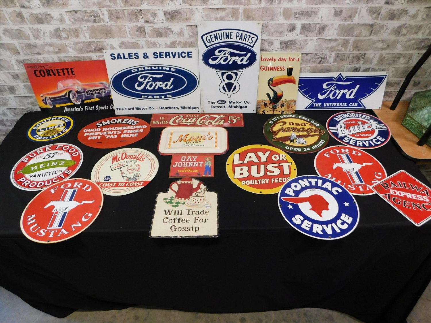 Lot of 18+ Newer Tin and Enamel Signs. Including Ford, Corvette, Mustang, Pontiac, Hines Pickles, Coca-Cola, McDonald’s, Railroad, and More. All reprints 1980’s to present day. Please read the terms and conditions. This sale will be broadcast live on sale day with full descriptions of each lot being sold. All items MUST be paid for within 24 HOURS of the sale. Anyone who has not paid within 24 hours will have a dispute opened against them and will not be able to bid at future sales. We use LIVE Ship from Liveauctioneers for all shipping. Liveauctioneers will pick up, pack and ship all items in this sale. Use the Quote button on this page. They wil include this charge in your invoice. If you are picking your items up you must contact us NO LATER than 24 hours after the sale to schedule an appointment to pick up. Pick up dates are Thursday, Friday, Saturday, and Monday ONLY, and are BY APPOINTMENT ONLY!! After Monday, if you have not picked up your items, they will be disposed of.