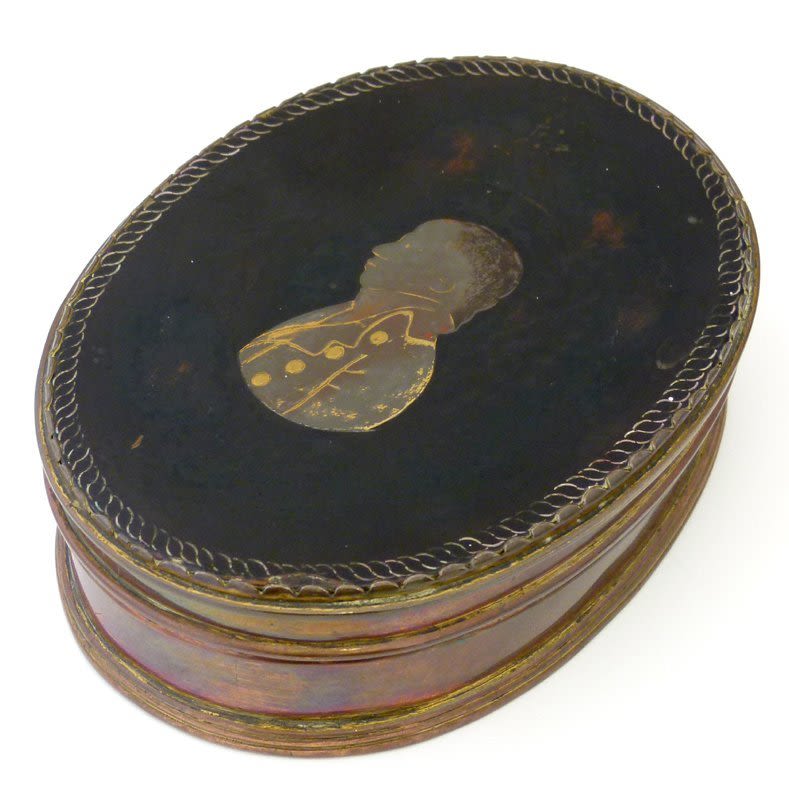 Late 18th century brass tobacco box lid decorated with a bust of a blackamoor interior with opal pique work.