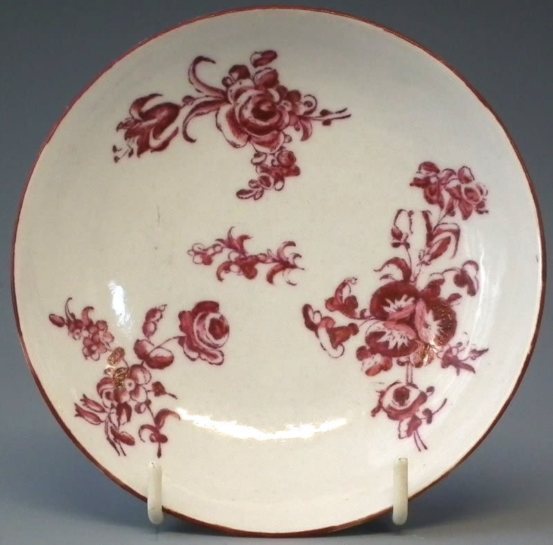 Bristol saucer circa 1770 with unusual pink printed pattern heightened in enamel, 12.5cm diameter Condition report: No damage or restoration.