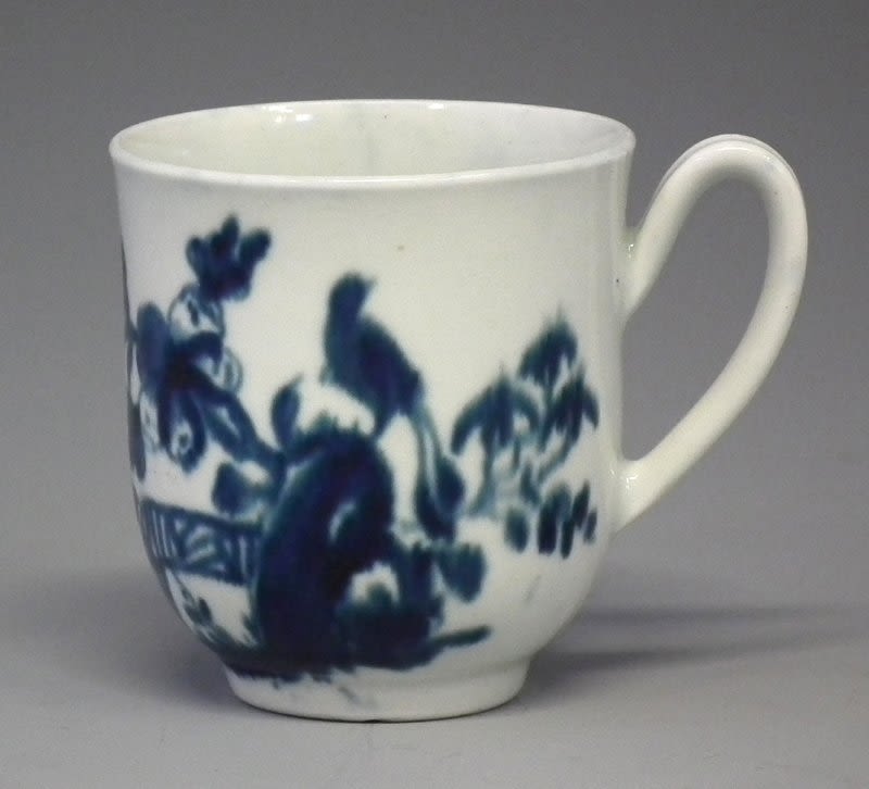 Worcester coffee cup circa 1755 painted with the Rock Warbler pattern in underglaze blue, workman’s mark to base, 6cm high Condition report: footrim chip, no other damage or restoration.