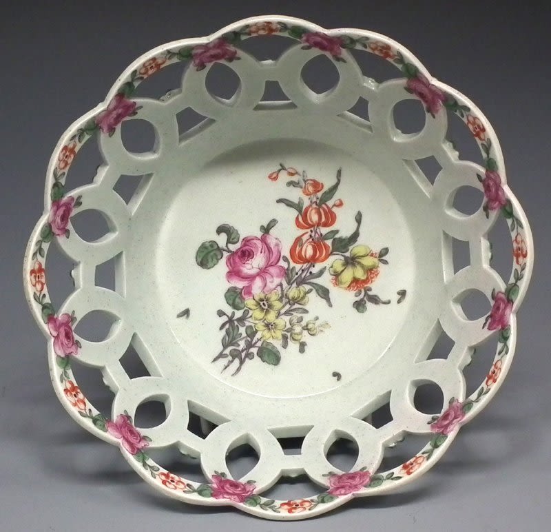 Worcester pierced basket circa 1760 painted with floral sprays in the manner of James Rogers, 21cm diameter Condition report: Some good restorations to the upper half of the pierced border.
