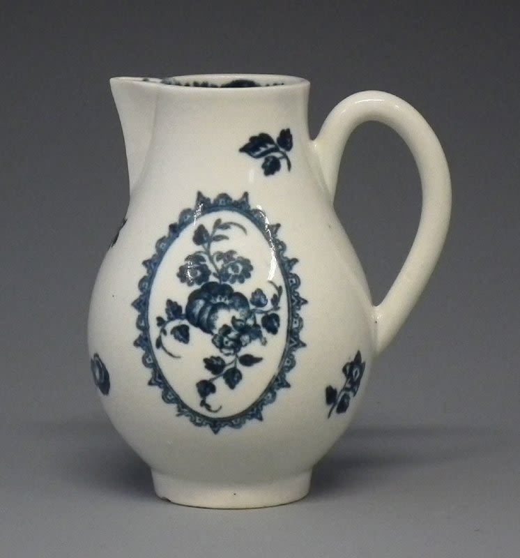Worcester sparrow beak jug circa 1780 printed with Fruit Wreath pattern in underglaze blue, crescent mark to base, 10.5cm high Condition report: Small foot rim chip. No other damage or restoration.