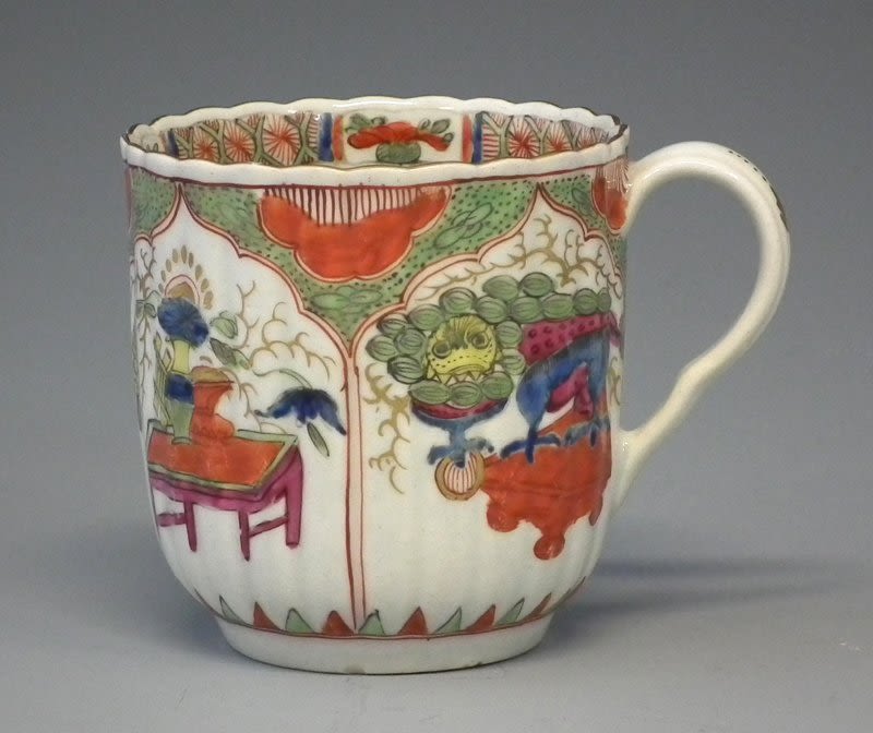 Worcester coffee cup circa 1780 painted with Dragon in Compartments pattern, 6.5cm high Condition report: Small chip to footrim, minor touches of gilt wear.
