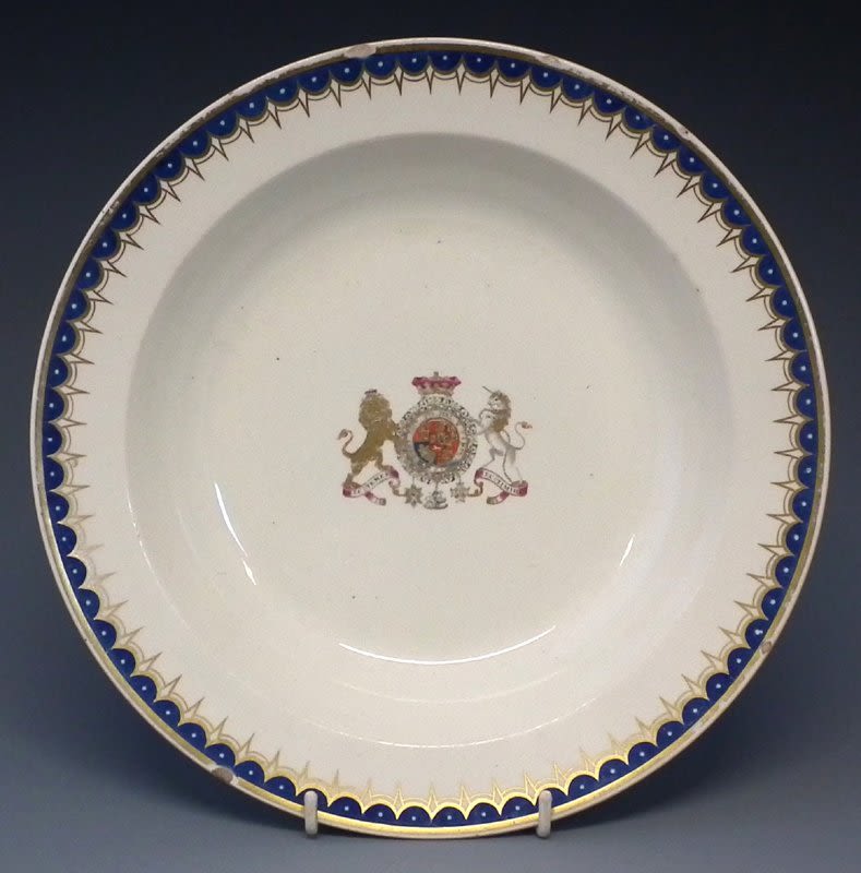Wedgwood creamware bowl from The Duke of Clarence service circa 1800 painted with the Royal Arms within blue and gilt border, impressed mark to base, 25cm diameter Condition report: Three rim chips to the edges, some wear and rubbing to the gilt.