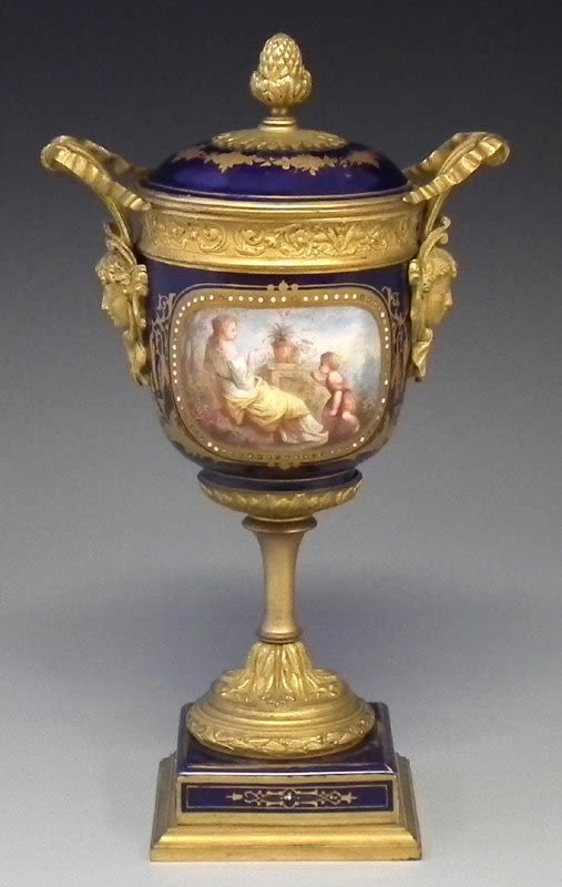 Sevres lidded vase with ormolu mounts painted with figures within gilded and jewelled blue ground, painted mark to base, (concealed by mounts) impressed ‘JM’ to base, mid 19th century 31cm high Condition report: No damage or restoration. Some wear to the gilt.