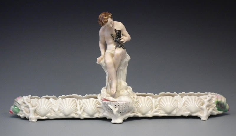 Royal Worcester flower trough modelled with a boy seated with a pet dog, impressed and moulded marks to base, 46cm wide Condition report: Small chip to the front of the shell. No other damage or restoration.