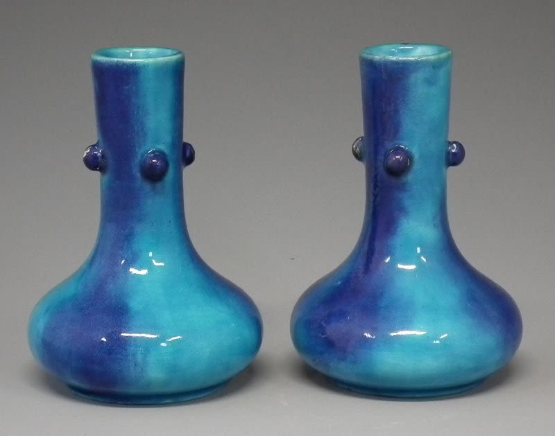 Pair of Minton vases decorated with overall turquoise glazes, each neck applied with four prunts, impressed marks and 1873 date codes to bases, 11cm high Condition report: One of the prunts has been restuck as has a glaze chip to the rim. There are minor glaze flakes to the prunts. Overall fine crazing.
