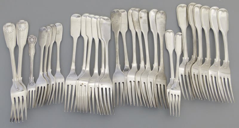Collection of Georgian and later table and dessert forks, chiefly of various fiddle patterns, 65oz 4dwt in total.