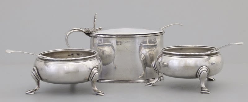 Pair of silver cushion salts, John Munns, London 1758; pair George III silver spoons; George III silver plain oval mustard pot and liner, Hy Hobdell, London 1785 and a 1785 spoon 8oz 10dwt in total (6).
