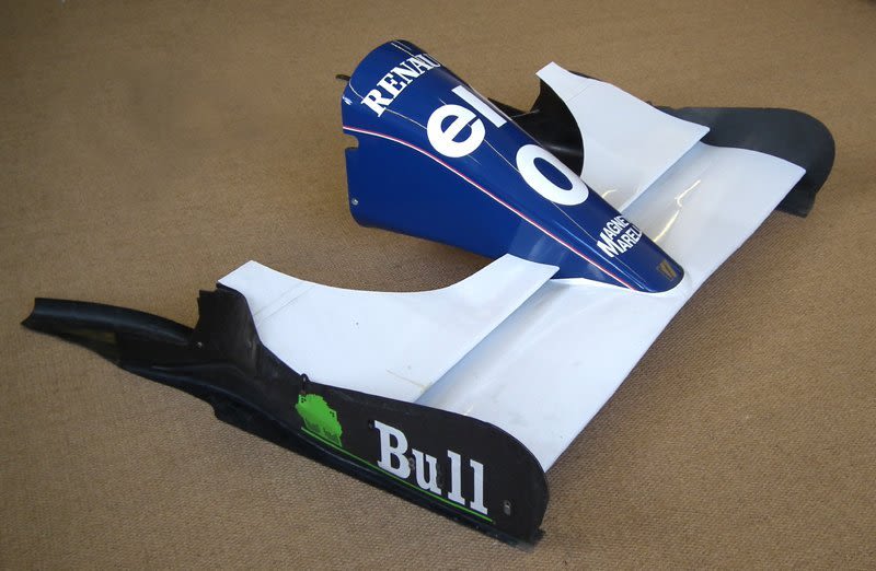 Formula One Renault Williams Elf team nose cone believed to have been available as a spare for Damon Hill’s race car bearing number ‘0’ of carbon fibre construction. 140cm x 125cm