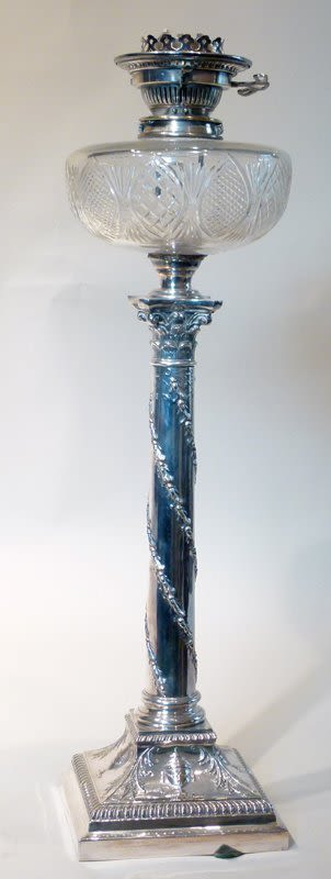 Victorian electro-plated Corinthian column table oil lamp, possibly by Hawksworth Eyre & Co, with a colourless cut glass reservoir, height to burner 66cm.