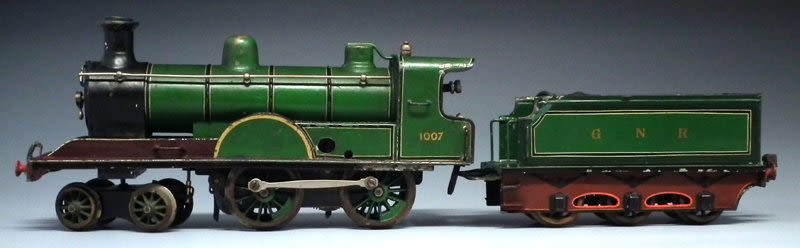DESCRIPTION ALTERED Marklin Gauge 1 4-4-0 tin plate clockwork locomotive and tender in green G.N.R. livery number 1007, 55cm long Condition report: No Key. Movement winds and operates at the time of cataloguing however cannot be guaranteed as working correctly. One cab step plate missing. Front buffer plate dented, the buffers are slightly miss shaped. The tender lacks the top rails and has some dents and miss shaped areas.The enamel is play worn, chipped and crazed all over.