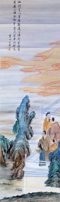 Chinese hanging scroll depicting figures on a balcony amongst clouds and mountains, picture area 168 x 47cm.