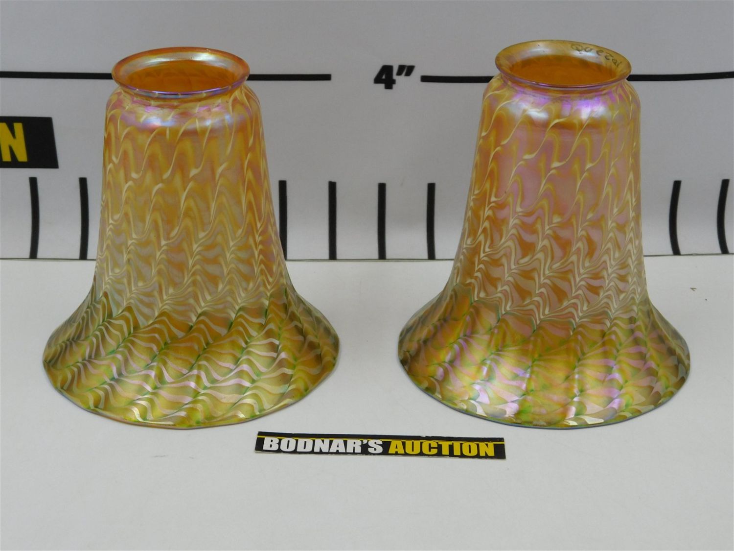 Pair of Quezal Art Glass Lamp Shades. Measures approx. 5.5" tall x 5.25" wide. Diameter of fitter is 2.25". All invoices must be paid within 24 hours of the sale. All items are shipped with Liveauctioneers Live Shipping. Local pickups are in our South Brunswick location on Friday, Saturday and Monday ONLY! All pickups are by appointment only. Any condition issues will be listed in the description. Please read the terms for full information.