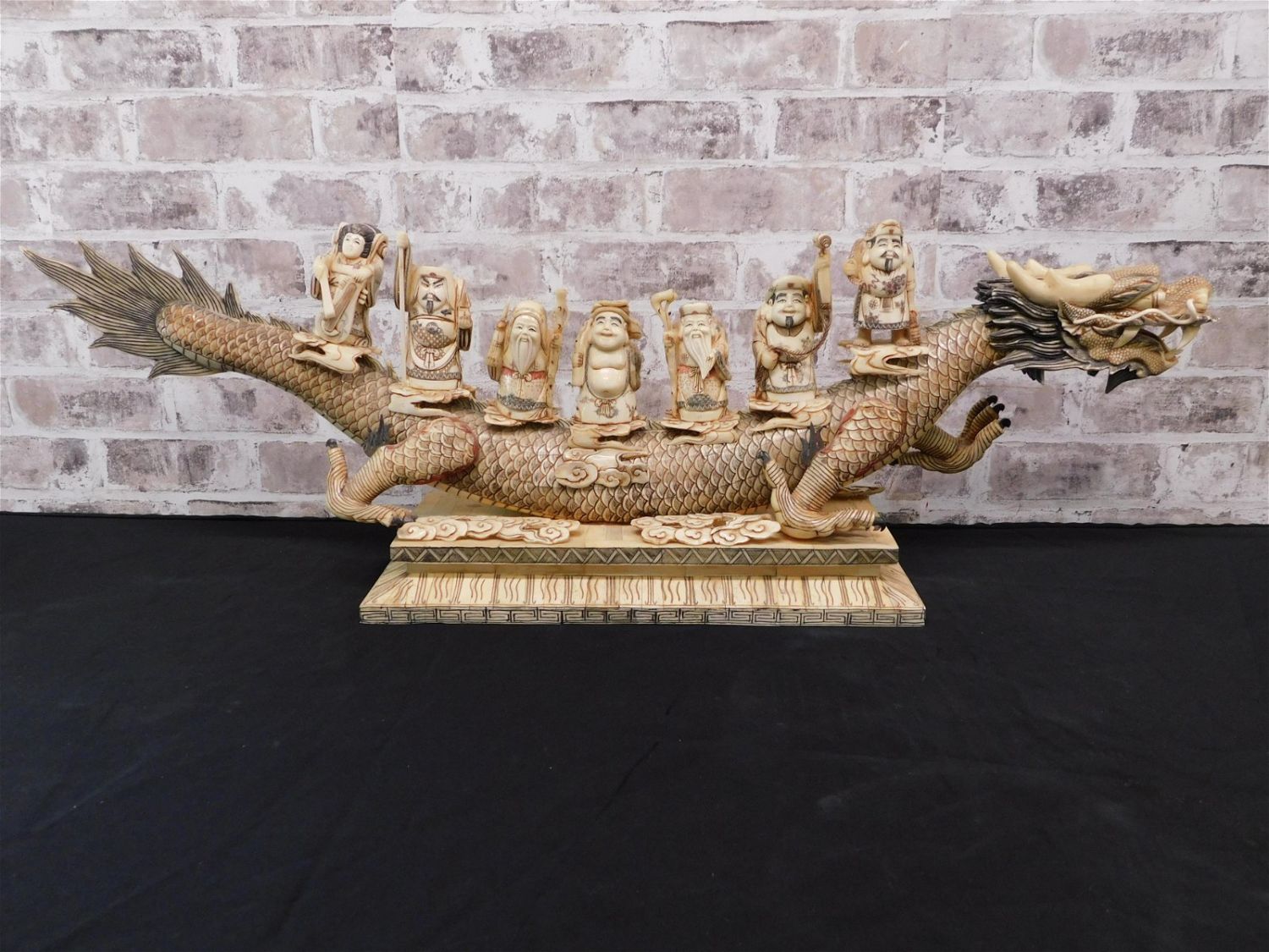 Carved Bone Chinese Dragon Boat Figure Statue with 7 Immortals. Left whisker is broken. Measures approx. 13" tall, 40" long, 7.5" deep. All invoices must be paid within 24 hours of the sale. All items are shipped with Liveauctioneers Live Shipping. Local pickups are in our South Brunswick location on Friday, Saturday and Monday ONLY! All pickups are by appointment only. Any condition issues will be listed in the description. Please read the terms for full information.