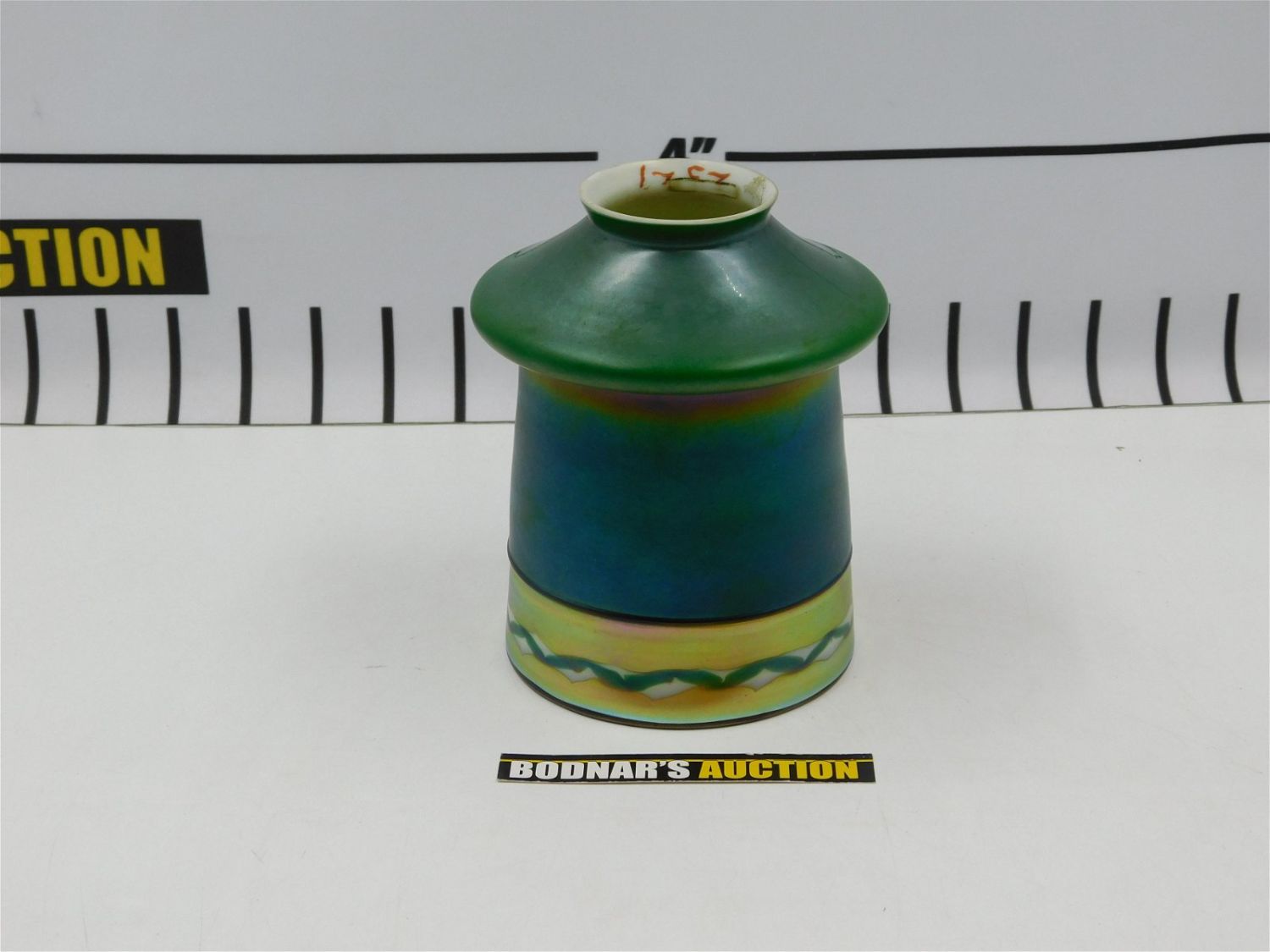 Art Glass Lamp Shade. Marking in Gold – Appears to be Steuben. Measures approx. 5.5" tall x 4" wide. Diameter of fitter Measures approx. 2". All invoices must be paid within 24 hours of the sale. All items are shipped with Liveauctioneers Live Shipping. Local pickups are in our South Brunswick location on Friday, Saturday and Monday ONLY! All pickups are by appointment only. Any condition issues will be listed in the description. Please read the terms for full information.