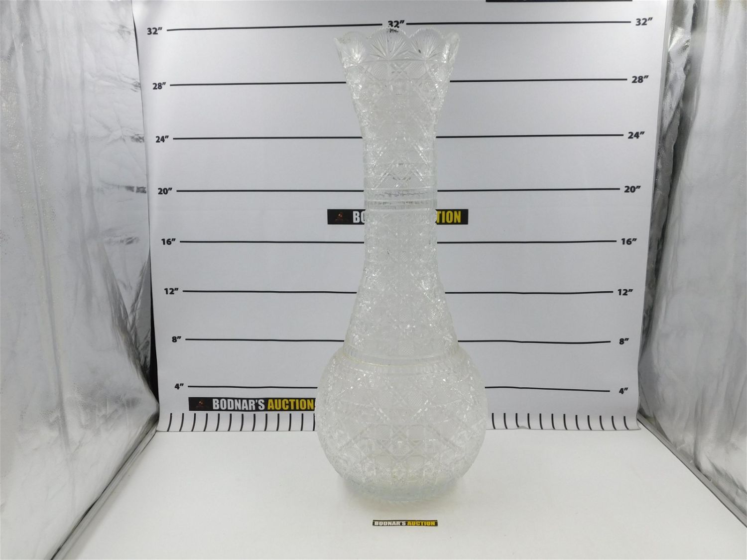 Oversized Cut Glass Floor Vase. Measures approx. 30" tall x 12" diameter. All invoices must be paid within 24 hours of the sale. All items are shipped with Liveauctioneers Live Shipping. Local pickups are in our South Brunswick location on Friday, Saturday and Monday ONLY! All pickups are by appointment only. Any condition issues will be listed in the description. Please read the terms for full information.