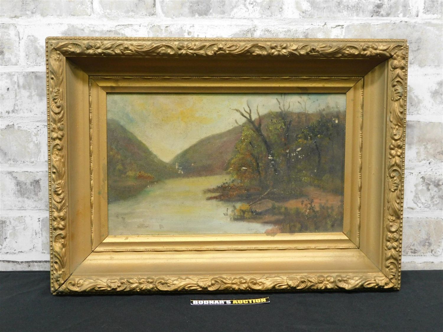 19th Century oil on canvas depicting a river scene. Painting has some minor paint loss. Frame measures approx. 14" tall x 19" wide. Please read the terms and conditions. This sale will be broadcast live on sale day with full descriptions of each lot being sold. All items MUST be paid for within 24 HOURS of the sale. Anyone who has not paid within 24 hours will have a dispute opened against them and will not be able to bid at future sales. All items in this sale are local pick up only, or shipping via Liveauctioneers Live Ship. If you are picking your items up you must contact us NO LATER than 24 hours after the sale to schedule an appointment to pick up. Pick up dates are Thursday, Friday, Saturday, and Monday ONLY, and are BY APPOINTMENT ONLY!! After Monday, if you have not picked up your items, they will be disposed of.