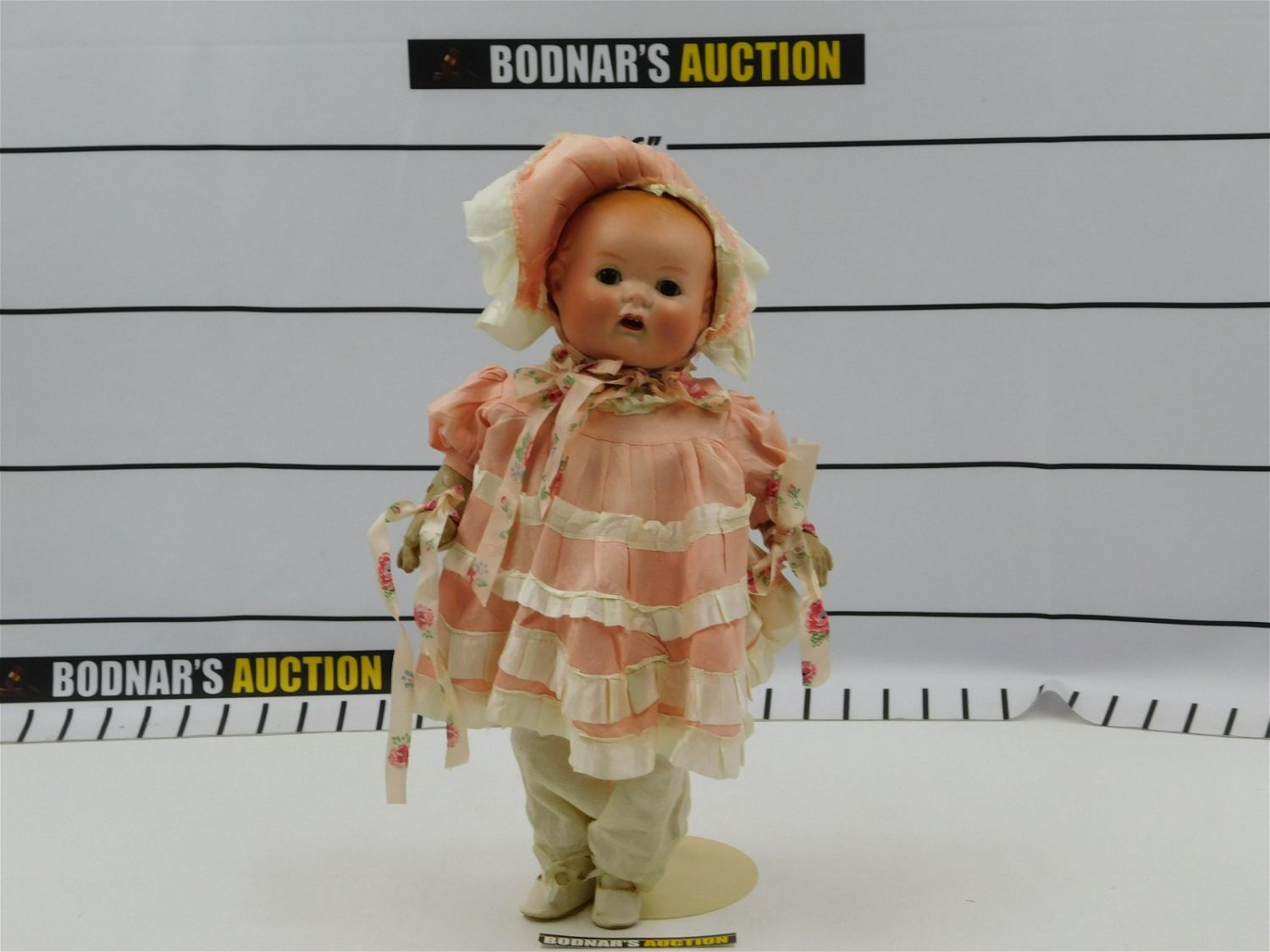 German porcelain head doll, marked on back 125, 2 1/2. Composition body with crazing and cracks. Has sleepy eyes, and minor paint loss to one cheek. Measures approx. 15" tall. All invoices must be paid within 24 hours of the sale. All items are shipped USPS or UPS and will be billed separately. A $10 handling fee is added to the shipping price per lot. Local pickups are in our South Brunswick location on Friday, Saturday and Monday ONLY! All pickups are by appointment only. Any condition issues will be listed in the description. Please read the terms for full information.