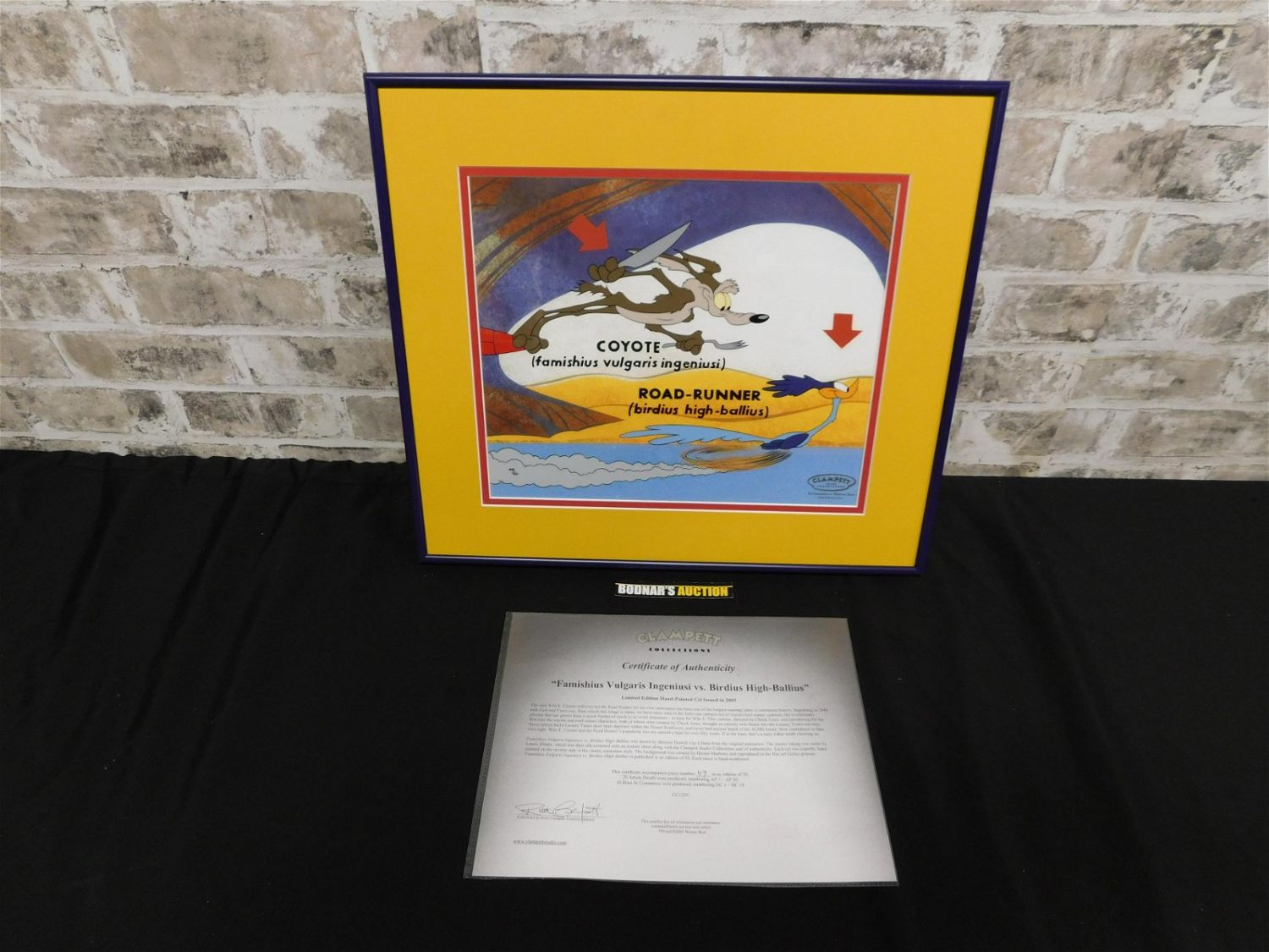 "Famishius Vulgaris Ingeniusu vs. Birdius High-Ballius" Limited Edition Hand Painted Cel. Featuring Wile E Coyote and Roadrunner. Limited Edition #49/50. Comes with COA. Framed and Matted. Measures 17.5" wide x 15.5" tall. Please read the terms and conditions. This sale will be broadcast live on sale day with full descriptions of each lot being sold. All items MUST be paid for within 24 HOURS of the sale. Anyone who has not paid within 24 hours will have a dispute opened against them and will not be able to bid at future sales. All items in this sale are local pick up only, or shipping via UPS Store in New Brunswick, NJ .. If you need your items shipped, we will send your items to the UPS Store in New Brunswick, NJ . They will pack it and ship it to you and you will pay them separately and directly. Please call them to get a quote before bidding. Their phone number is 732-354-4284. If you are picking your items up you must contact us NO LATER than 24 hours after the sale to schedule an appointment to pick up. Pick up dates are Thursday, Friday, Saturday, and Monday ONLY, and are BY APPOINTMENT ONLY!! After Monday, if you have not picked up your items, they will be disposed of.