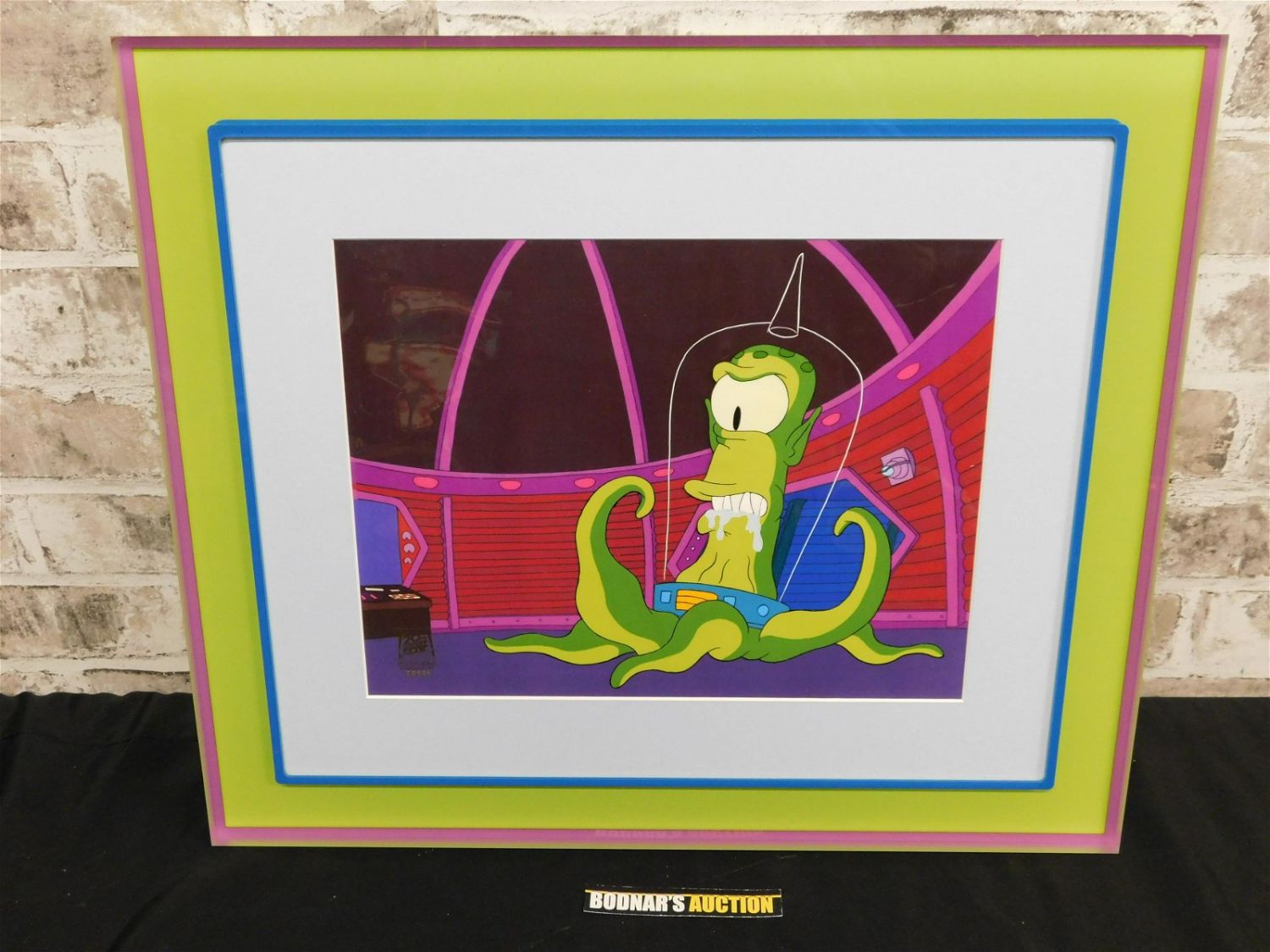 The Simpsons "Treehouse of Horror VII" Original Hand Painted Cel Set-Up – 20th Century Fox. Depicts Kodos. Professionally Framed and Matted. Small chip on lucite frame. Light scratch on frame. Measures 16.5" wide x 17" tall. Please read the terms and conditions. This sale will be broadcast live on sale day with full descriptions of each lot being sold. All items MUST be paid for within 24 HOURS of the sale. Anyone who has not paid within 24 hours will have a dispute opened against them and will not be able to bid at future sales. All items in this sale are local pick up only, or shipping via UPS Store in New Brunswick, NJ .. If you need your items shipped, we will send your items to the UPS Store in New Brunswick, NJ . They will pack it and ship it to you and you will pay them separately and directly. Please call them to get a quote before bidding. Their phone number is 732-354-4284. If you are picking your items up you must contact us NO LATER than 24 hours after the sale to schedule an appointment to pick up. Pick up dates are Thursday, Friday, Saturday, and Monday ONLY, and are BY APPOINTMENT ONLY!! After Monday, if you have not picked up your items, they will be disposed of.