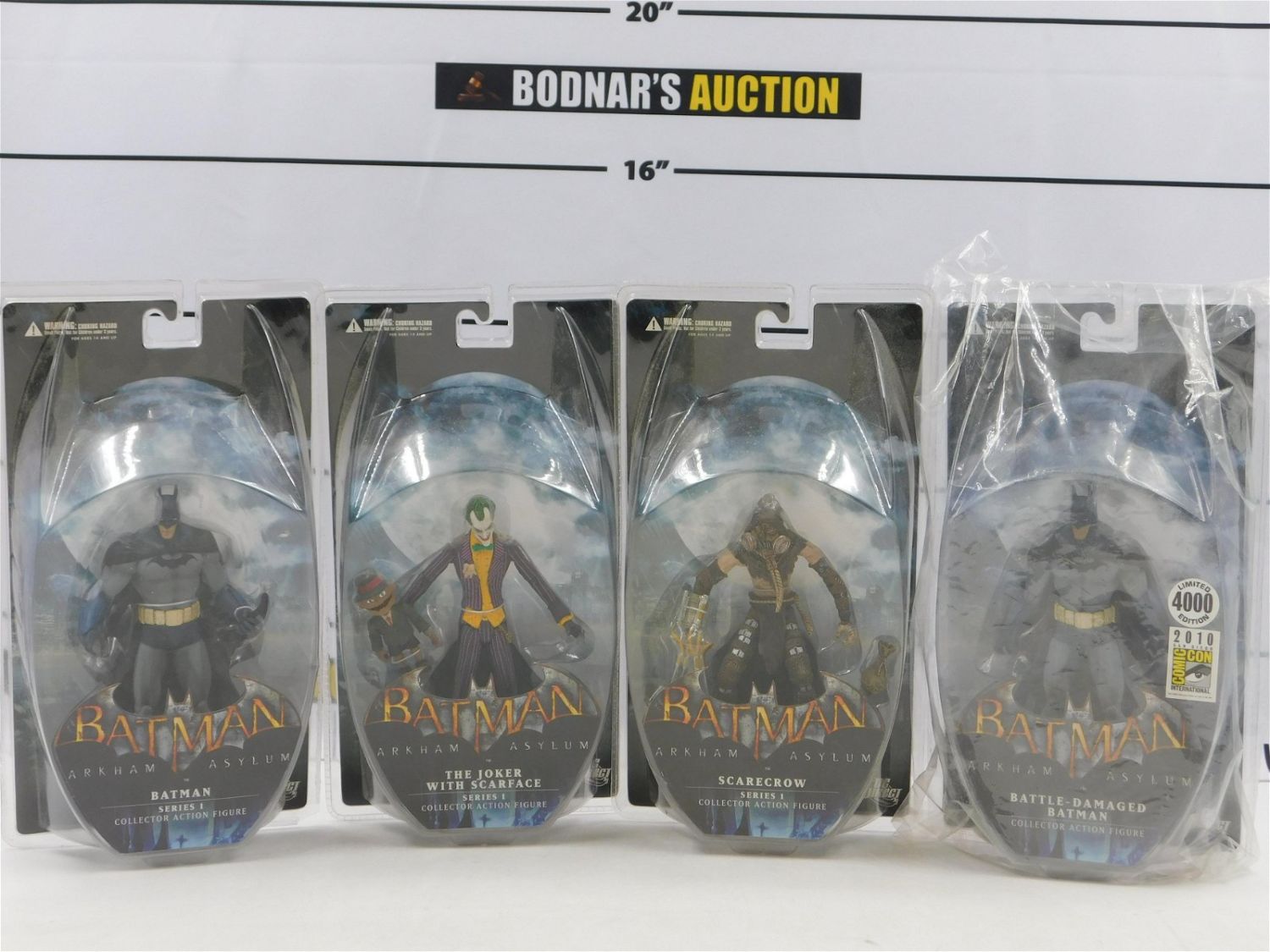Lot of 4 Batman Arkham Asylum Action Figures. Includes Battle-Damaged Batman – SDCC Exclusive, Batman Series 1, Scarecrow Series 1, and The Joker with Scarface Series 1. DC Direct. All items are shipped USPS or UPS and will be billed separately. A $10 handling fee is added to the shipping price per lot. Local pickups are in our South Brunswick location on Friday, Saturday and Monday ONLY! All pickups are by appointment only. Any condition issues will be listed in the description. Please read the terms for full information.