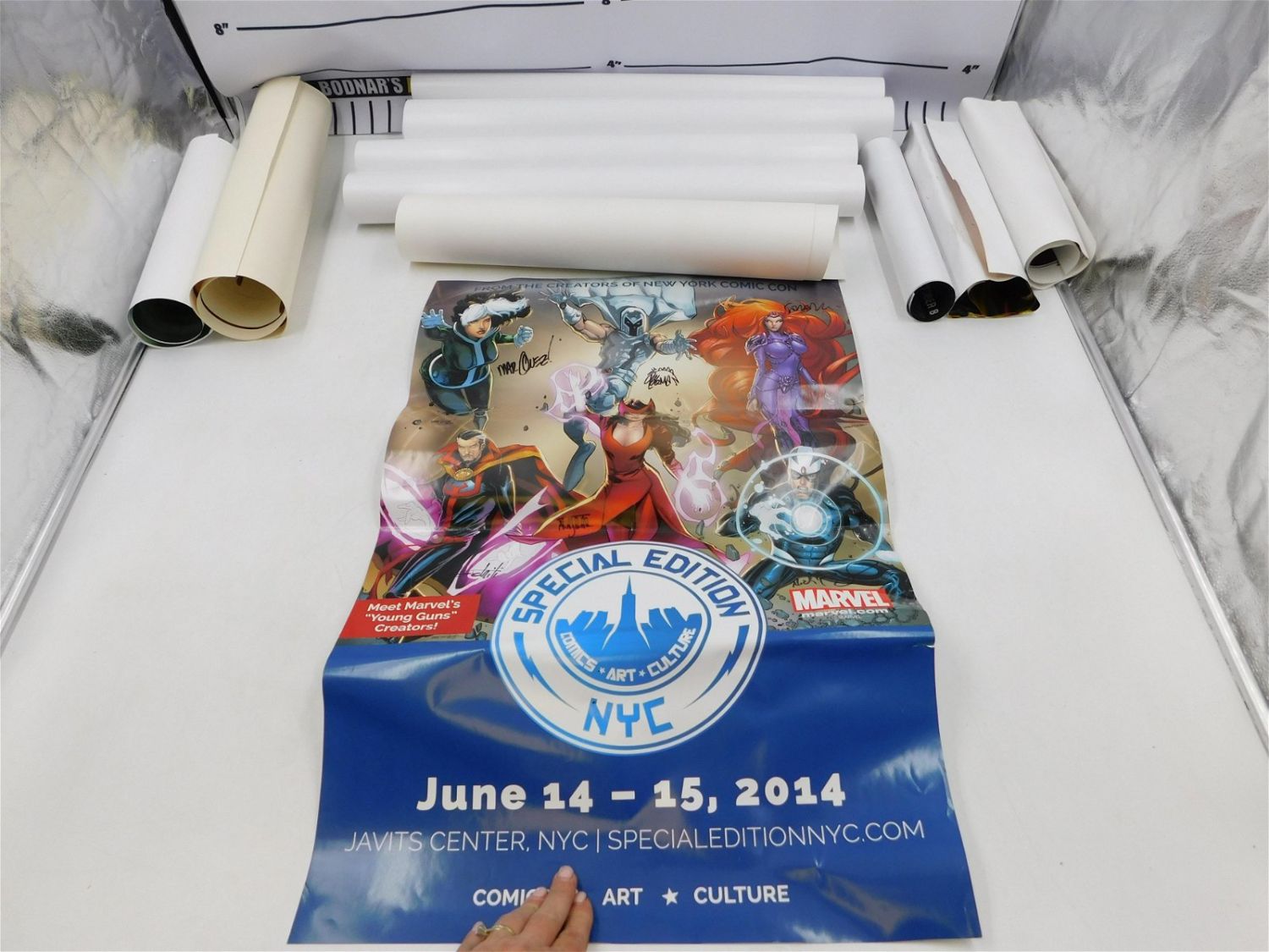Lot of 9 Posters – All Autographed. Including Stakes, Misfits, Artifacts, Spirit of America, Curse of Chucky, Comic Con, Romper Zombie. Various Sizes. Some personalized. Minor wear and tears/creasing. All invoices must be paid within 24 hours of the sale. All items are shipped USPS or UPS and will be billed separately. A $10 handling fee is added to the shipping price per lot. Local pickups are in our South Brunswick location on Friday, Saturday and Monday ONLY! All pickups are by appointment only. Any condition issues will be listed in the description. Please read the terms for full information.