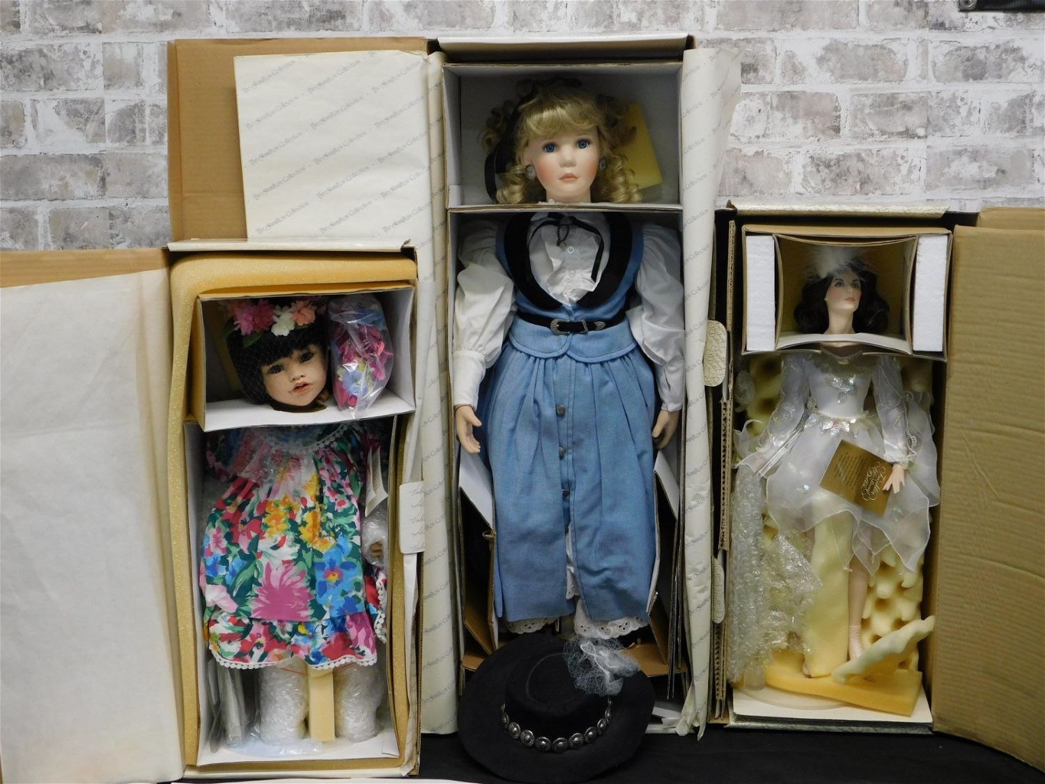 Lot of 3 Porcelain Dolls including World Gallery Aloha by Valeria Shelton with Box and COA measuring 19", Franklin Heirloom Peggy Fleming with COA and Box measuring 20", and Bonnie by Tanya Tucker Hamilton Collection in Box with Paperwork measuring 28". This sale will be broadcast live on sale day with full descriptions of each lot being sold. All items MUST be paid for within 24 HOURS of the sale. Anyone who has not paid within 24 hours will have a dispute opened against them and will not be able to bid at future sales. All items in this sale are local pick up only, or shipping via UPS store in Kendall Park, NJ.. If you need your items shipped, we will send your items to the UPS store in Kendall Park, NJ . They will pack it and ship it to you and you will pay them separately and directly. Please call them to get a quote before bidding. Their phone number is 732-422-7242. If you are picking your items up you must contact us NO LATER than 24 hours after the sale to schedule an appointment to pick up. Pick up dates are Thursday, Friday, Saturday, and Monday ONLY, and are BY APPOINTMENT ONLY!! After Monday, if you have not picked up your items, they will be disposed of.