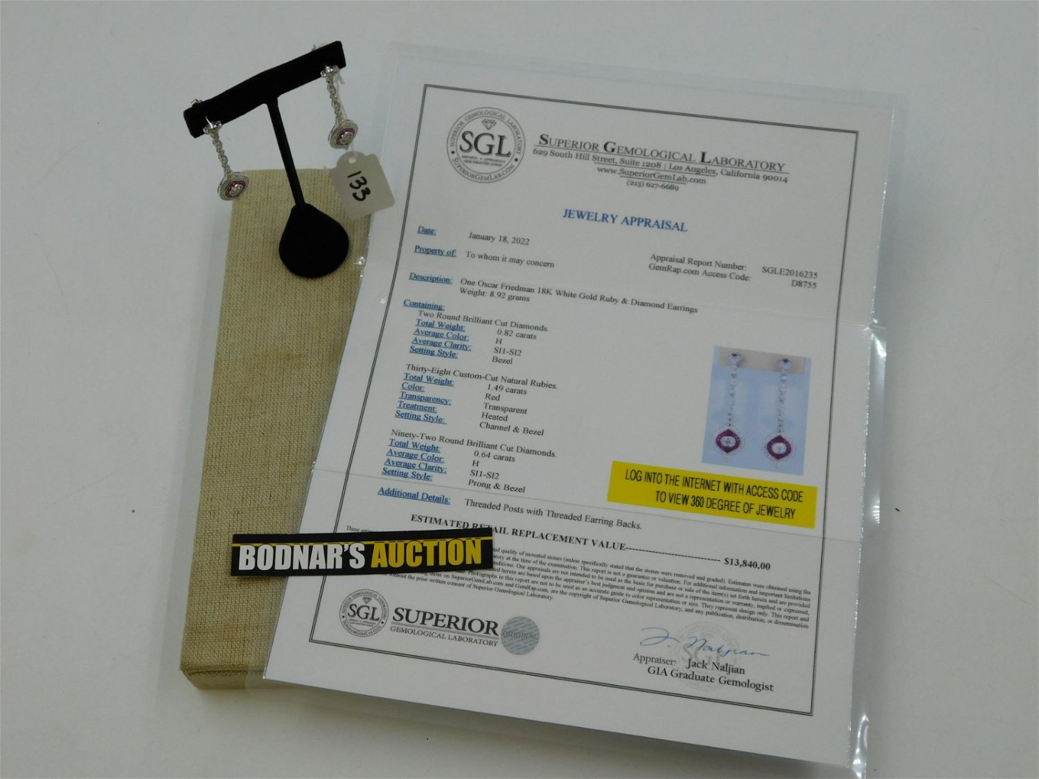 Pair of Oscar Friedman 18KT White Gold, Ruby and Diamond Earrings. Has 2 round brilliant cut diamonds totaling .82 ct. Color H, Clarity SI1-SI2. Surrounded by 38 custom cut natural rubies totaling 1.49 ct. and 92 round brilliant cut diamonds totaling .64 ct. Measures approx. 2.25" long. There are no reserves in the entire sale. All invoices must be paid within 24 hours of the sale. All items are shipped USPS or UPS and will be billed separately. A $10 handling fee is added to the shipping price per lot. Local pickups are in our South Brunswick location on Friday, Saturday and Monday ONLY! All pickups are by appointment only. Any condition issues will be listed in the description. Please read the terms for full information.