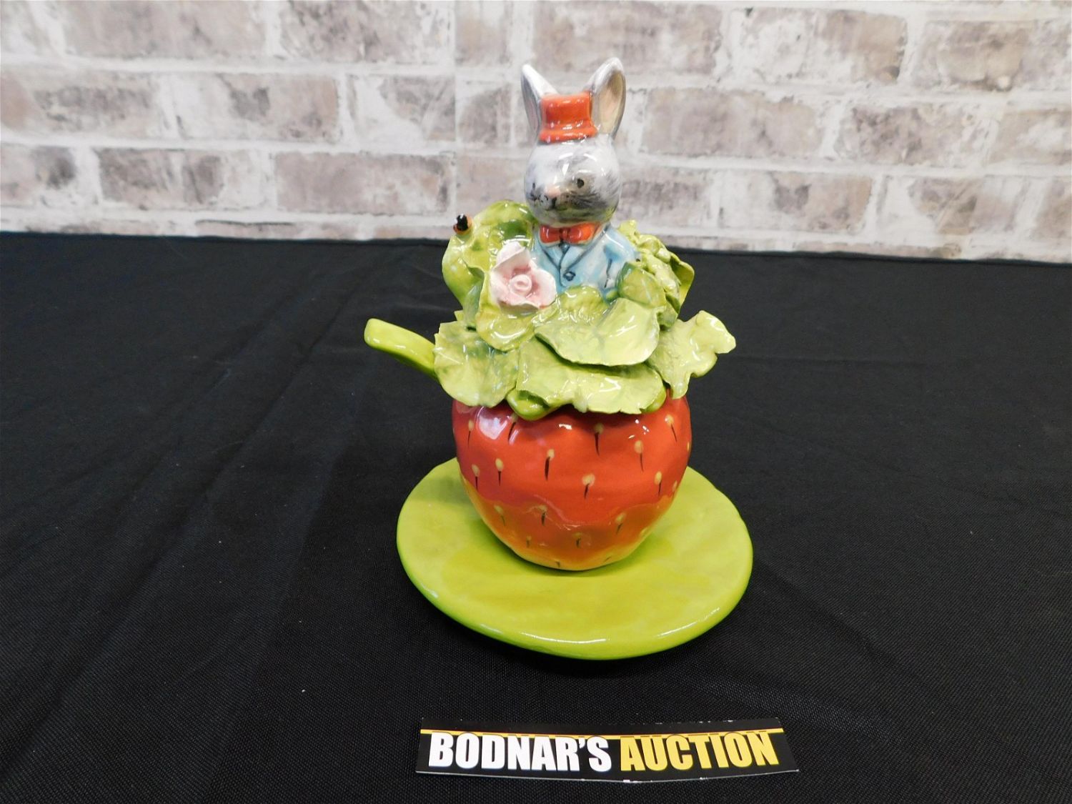 Eva Gordon Whimsical Hand Painted Covered Condiment in the form of Strawberry with Rabbit on Top. Has ladle and Underplate. Measures 7" tall x 5" wide This sale will be broadcast live on sale day with full descriptions of each lot being sold. All items MUST be paid for within 24 HOURS of the sale. Anyone who has not paid within 24 hours will have a dispute opened against them and will not be able to bid at future sales. All items in this sale are local pick up only, or shipping via UPS store in Kendall Park, NJ.. If you need your items shipped, we will send your items to the UPS store in Kendall Park, NJ . They will pack it and ship it to you and you will pay them separately and directly. Please call them to get a quote before bidding. Their phone number is 732-422-7242. If you are picking your items up you must contact us NO LATER than 24 hours after the sale to schedule an appointment to pick up. Pick up dates are Thursday, Friday, Saturday, and Monday ONLY, and are BY APPOINTMENT ONLY!! After Monday, if you have not picked up your items, they will be disposed of.