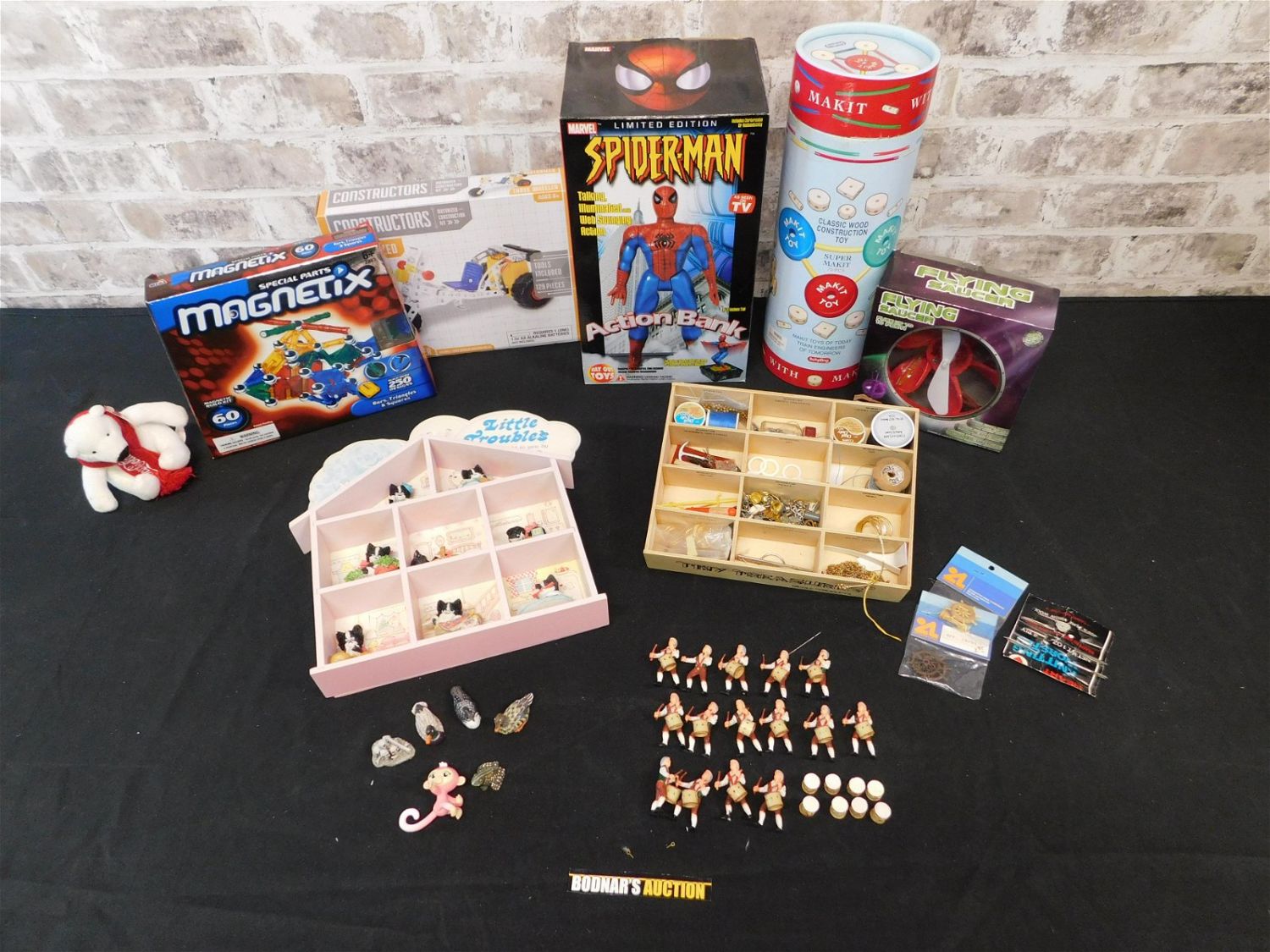 Lot of Mixed Toys including Construction Kit, Magnetix, Spiderman Action Bank, Flying Saucer and More. All items are shipped USPS or UPS and will be billed separately. A $10 handling fee is added to the shipping price per lot. Local pickups are in our South Brunswick location on Friday, Saturday and Monday ONLY! All pickups are by appointment only. Any condition issues will be listed in the description. Please read the terms for full information.