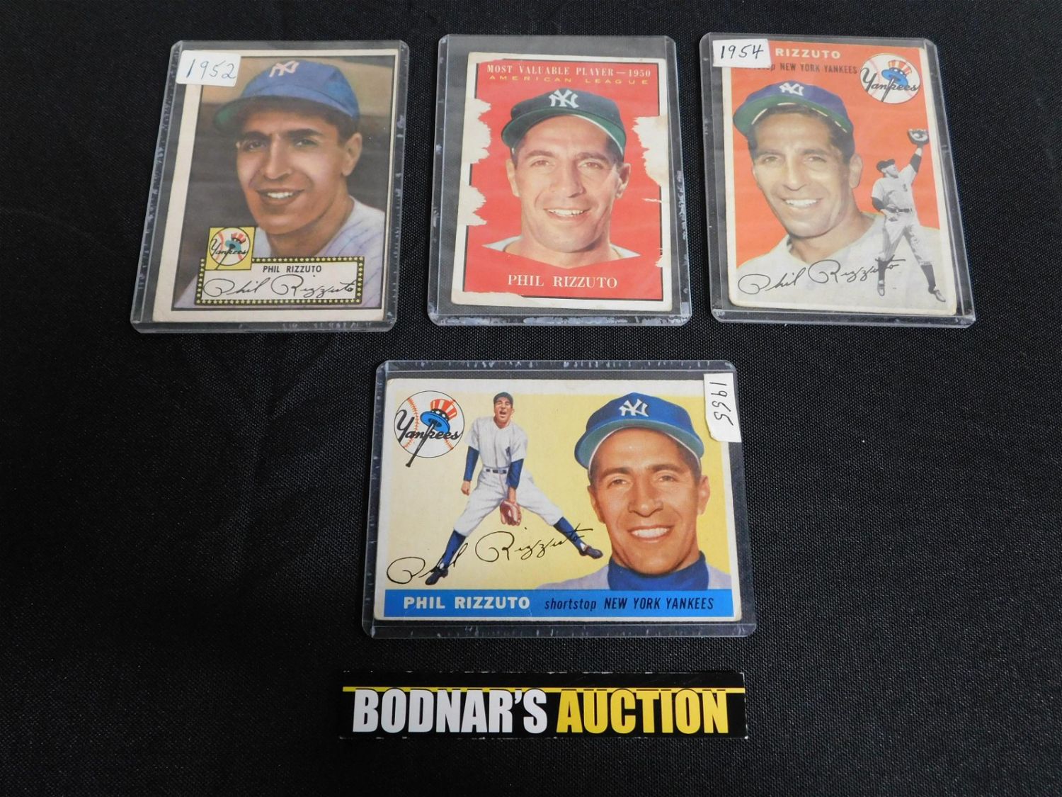 Lot of 4 Phil Rizzuto Baseball Cards including 1952 Topps #11, 1954 Topps #17, 1955 Topps #189, and 1961 Topps #471 – Poor Condition. All items are shipped USPS or UPS and will be billed separately. A $10 handling fee is added to the shipping price per lot. Local pickups are in our South Brunswick location on Friday, Saturday and Monday ONLY! All pickups are by appointment only. Any condition issues will be listed in the description. Please read the terms for full information.