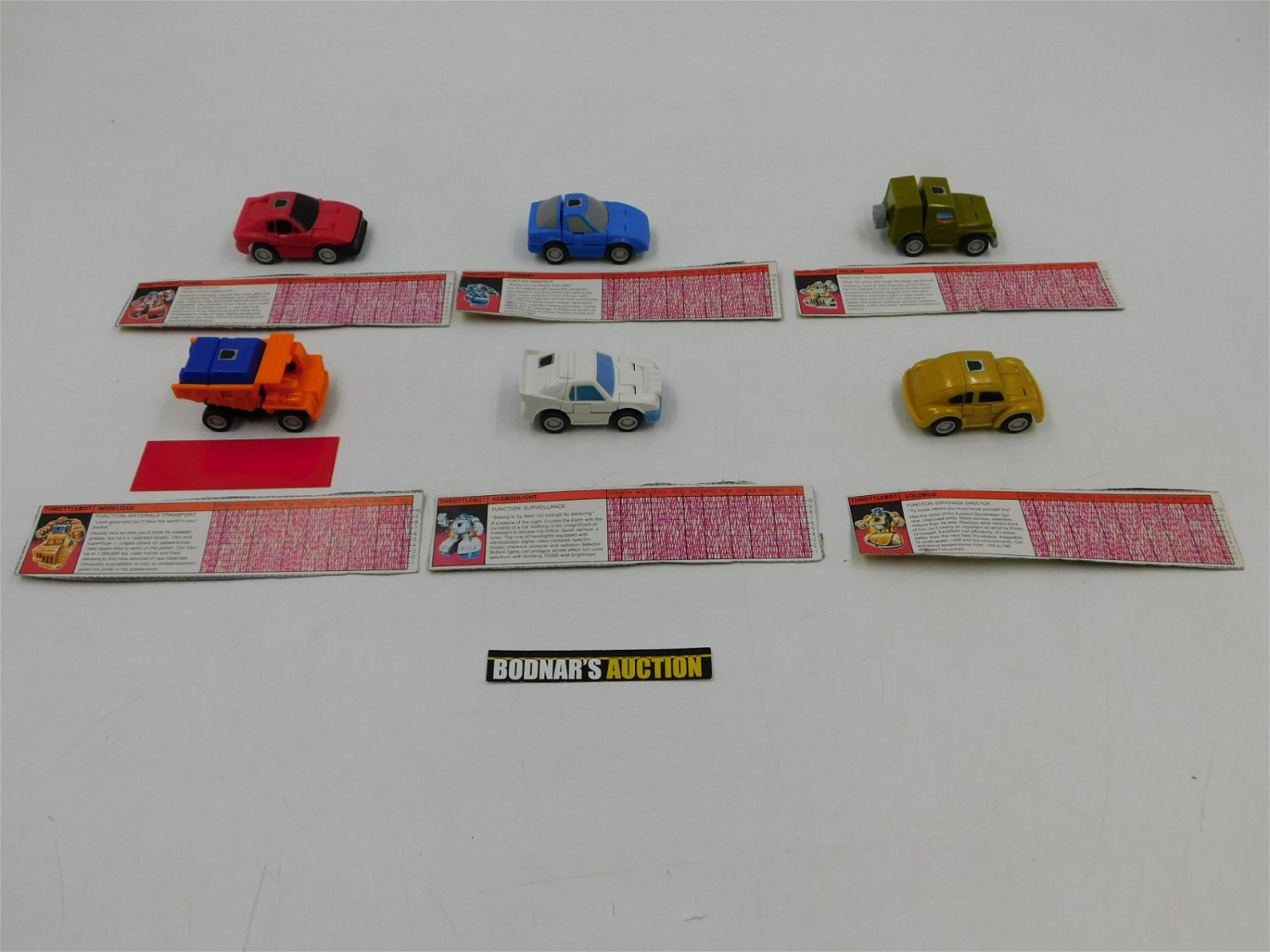 Lot of 6 Throttlebot G1 Transformers 1987 including Searchlight, Wideload, Freeway, Goldbug, Rollbar, and Chase. All items are shipped USPS or UPS and will be billed separately. A $10 handling fee is added to the shipping price per lot. Local pickups are in our South Brunswick location on Friday, Saturday and Monday ONLY! All pickups are by appointment only. Any condition issues will be listed in the description. Please read the terms for full information.