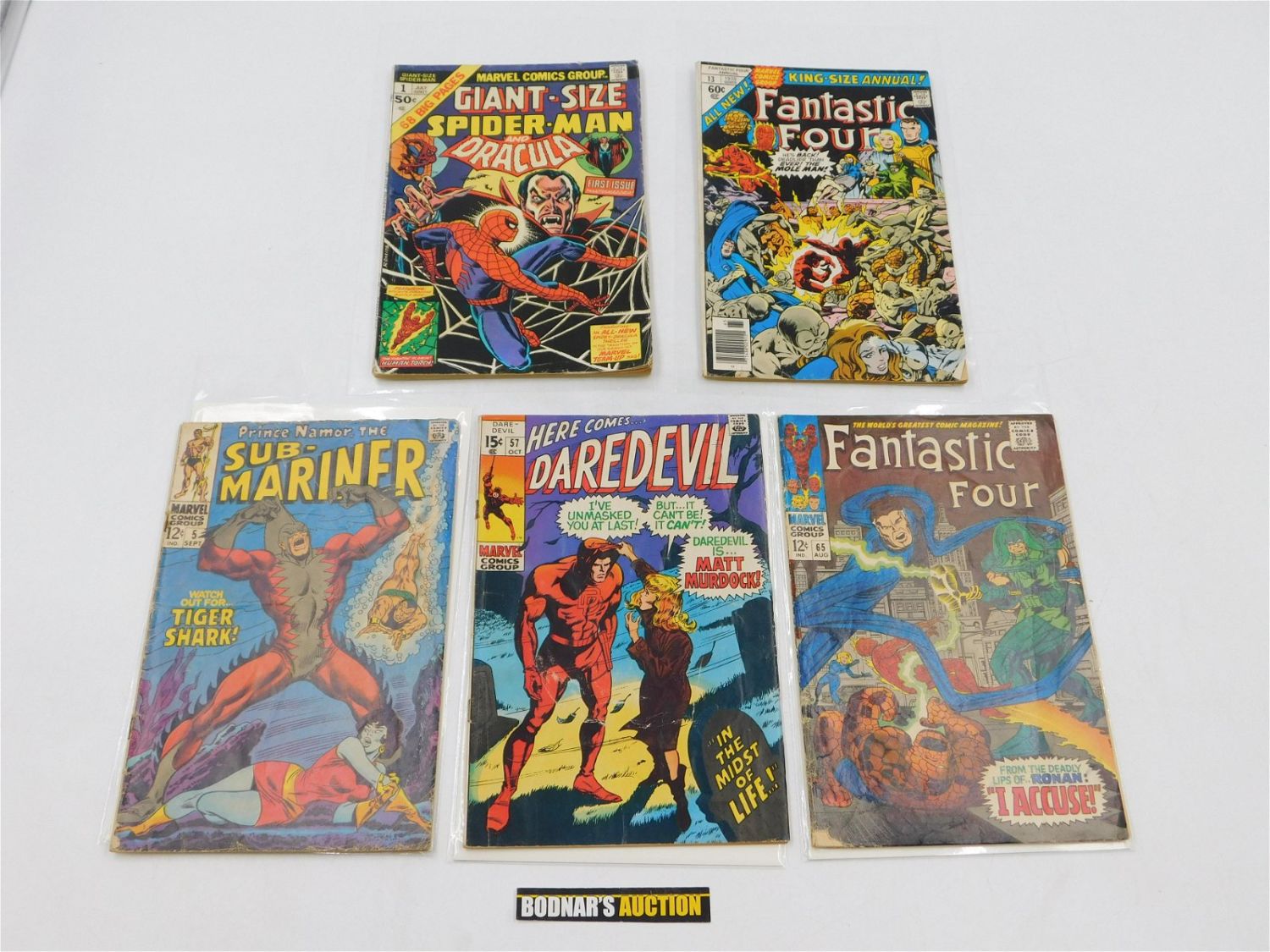 Lot of 5 Marvel Silver Age Key Issues including Sub-Mariner #5, Daredevil #57 and Fantastic Four #65, Giant Size Spider-Man and Dracula #1 and Fantastic Four King Size Annual #13. Fantastic Four #65 has substantial amateur color touch on the front and completely detached. Please read the terms and conditions. This sale will be broadcast live on sale day with full descriptions of each lot being sold. All items MUST be paid for within 24 HOURS of the sale. Anyone who has not paid within 24 hours will have a dispute opened against them and will not be able to bid at future sales. All items in this sale are local pick up only, or shipping via UPS store in Kendall Park, NJ.. If you need your items shipped, we will send your items to the UPS store in Kendall Park, NJ . They will pack it and ship it to you and you will pay them separately and directly. Please call them to get a quote before bidding. Their phone number is 732-422-7242. If you are picking your items up you must contact us NO LATER than 24 hours after the sale to schedule an appointment to pick up. Pick up dates are Thursday, Friday, Saturday, and Monday ONLY, and are BY APPOINTMENT ONLY!! After Monday, if you have not picked up your items, they will be disposed of.