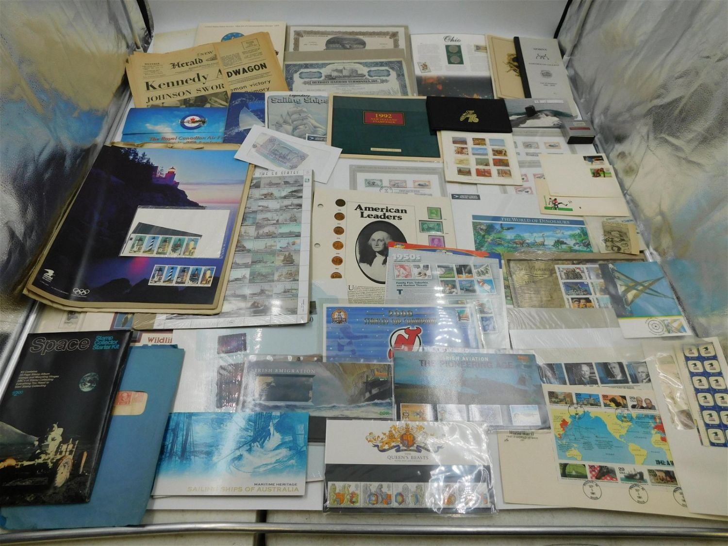Large lot of ephemera and stamps including loose stamps, first day covers, foreign blocks, starter sets as well as stock certificates from Detroit Harbor Terminals and US Eclectic Power Company, misc. newspaper clippings and more. It is a real treasure box! All invoices must be paid within 24 hours of the sale. All items are shipped USPS or UPS and will be billed separately. A $10 handling fee is added to the shipping price per lot. Local pickups are in our South Brunswick location on Friday, Saturday and Monday ONLY! All pickups are by appointment only. Any condition issues will be listed in the description. Please read the terms for full information.