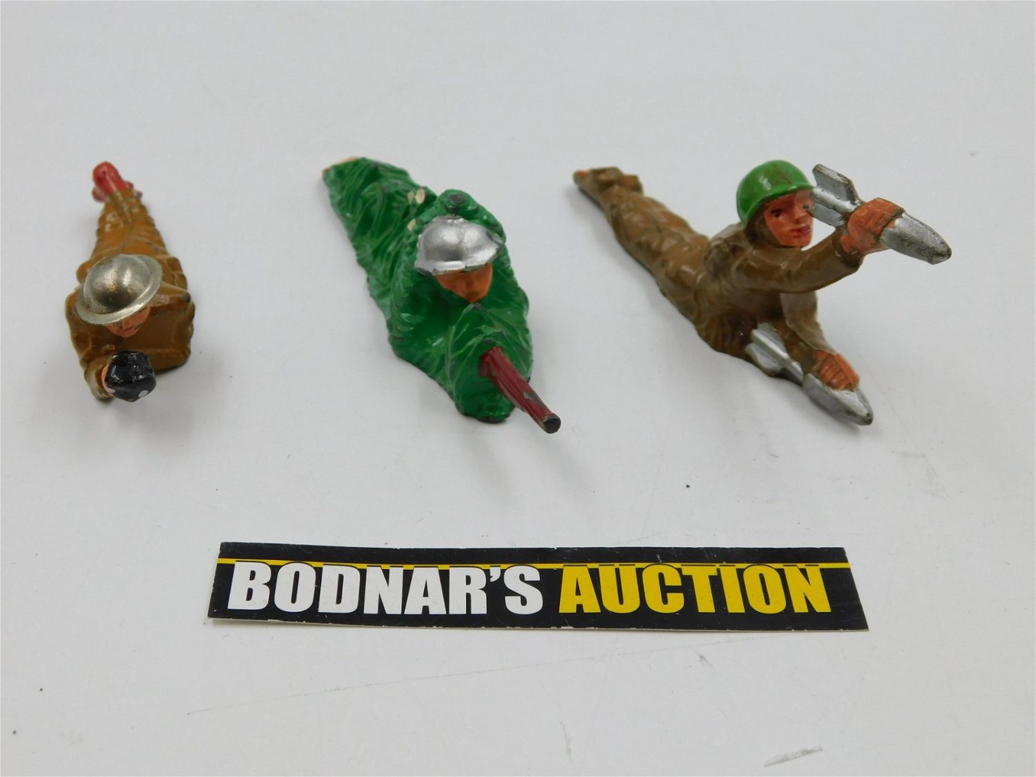 Lot of 3 Vintage Toy Soldiers including 2 Marked Manoil – Camo Sharp Shooter #57 and #46/14 Missile Loader and Other Unmarked Soldier Scouting. Measures approx. 2" – 4". All invoices must be paid within 24 hours of the sale. All items are shipped either in house via USPS/UPS or will be sent to the Kendall Park UPS store to be packed and shipped. All shipping is billed separately. You will be contacted via email after the invoice is paid advising you on the shipping method. All in house shipping will have a $10 handling fee added per item. Local pickups are in our South Brunswick location on Friday, Saturday and Monday ONLY! All pickups are by appointment only. Any condition issues will be listed in the description. Please read the terms for full information.