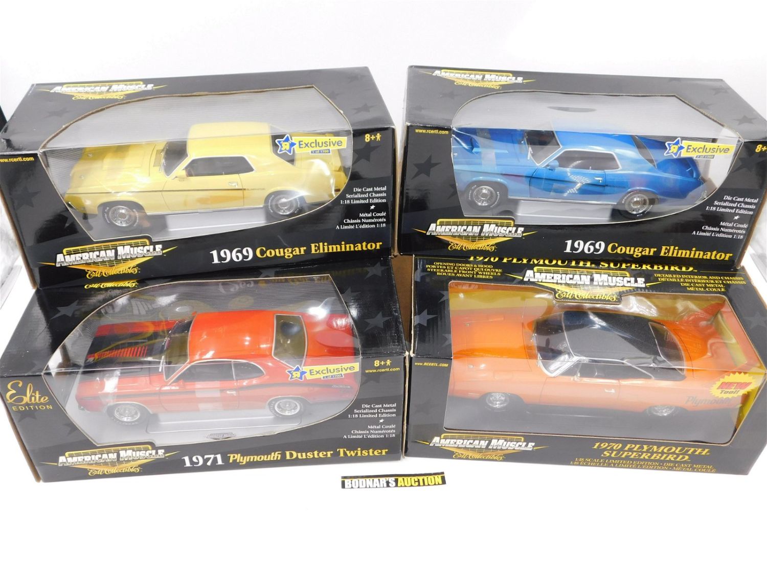 Lot of 4 American Muscle Diecast Cars including (2) 1969 Cougar Eliminator – Toys R Us Exclusive (Blue and Yellow), 1970 Plymouth Superbird, and 1971 Plymouth Duster Twister. All Limited Edition 1:18 Scale Diecast. Comes in Original Box. All invoices must be paid within 24 hours of the sale. All items are shipped USPS or UPS and will be billed separately. A $10 handling fee is added to the shipping price per lot. Local pickups are in our South Brunswick location on Friday, Saturday and Monday ONLY! All pickups are by appointment only. Any condition issues will be listed in the description. Please read the terms for full information.