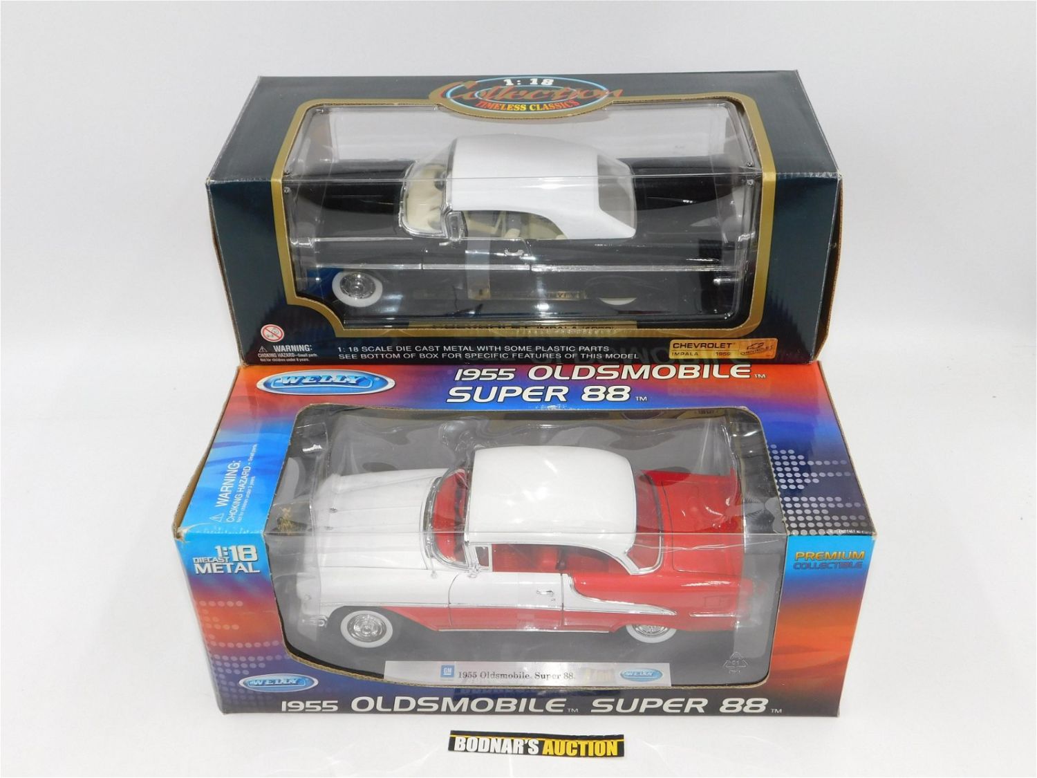 Lot of 2 Diecast Cars including Timeless Classics 1959 Chevrolet Impala and Welly 1955 Oldsmobile Super 88. 1:18 Scale Diecast. Comes in Original Box. All invoices must be paid within 24 hours of the sale. All items are shipped USPS or UPS and will be billed separately. A $10 handling fee is added to the shipping price per lot. Local pickups are in our South Brunswick location on Friday, Saturday and Monday ONLY! All pickups are by appointment only. Any condition issues will be listed in the description. Please read the terms for full information.