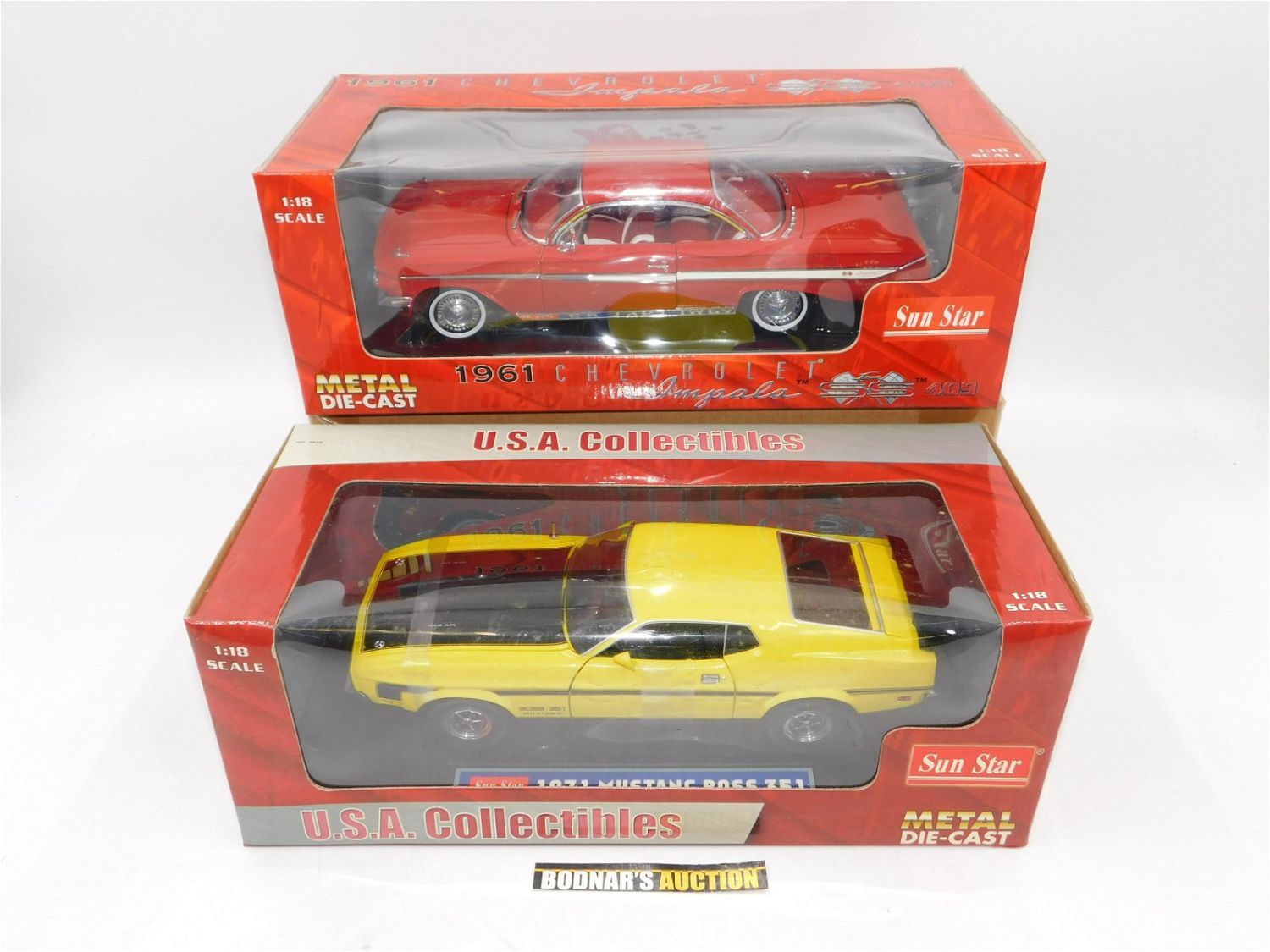 Lot of 2 Sun Star Diecast Cars including 1961 Chevrolet Impala and 1971 Mustang Boss 351. 1:18 Scale Diecast. Comes in Original Box. All invoices must be paid within 24 hours of the sale. All items are shipped USPS or UPS and will be billed separately. A $10 handling fee is added to the shipping price per lot. Local pickups are in our South Brunswick location on Friday, Saturday and Monday ONLY! All pickups are by appointment only. Any condition issues will be listed in the description. Please read the terms for full information.