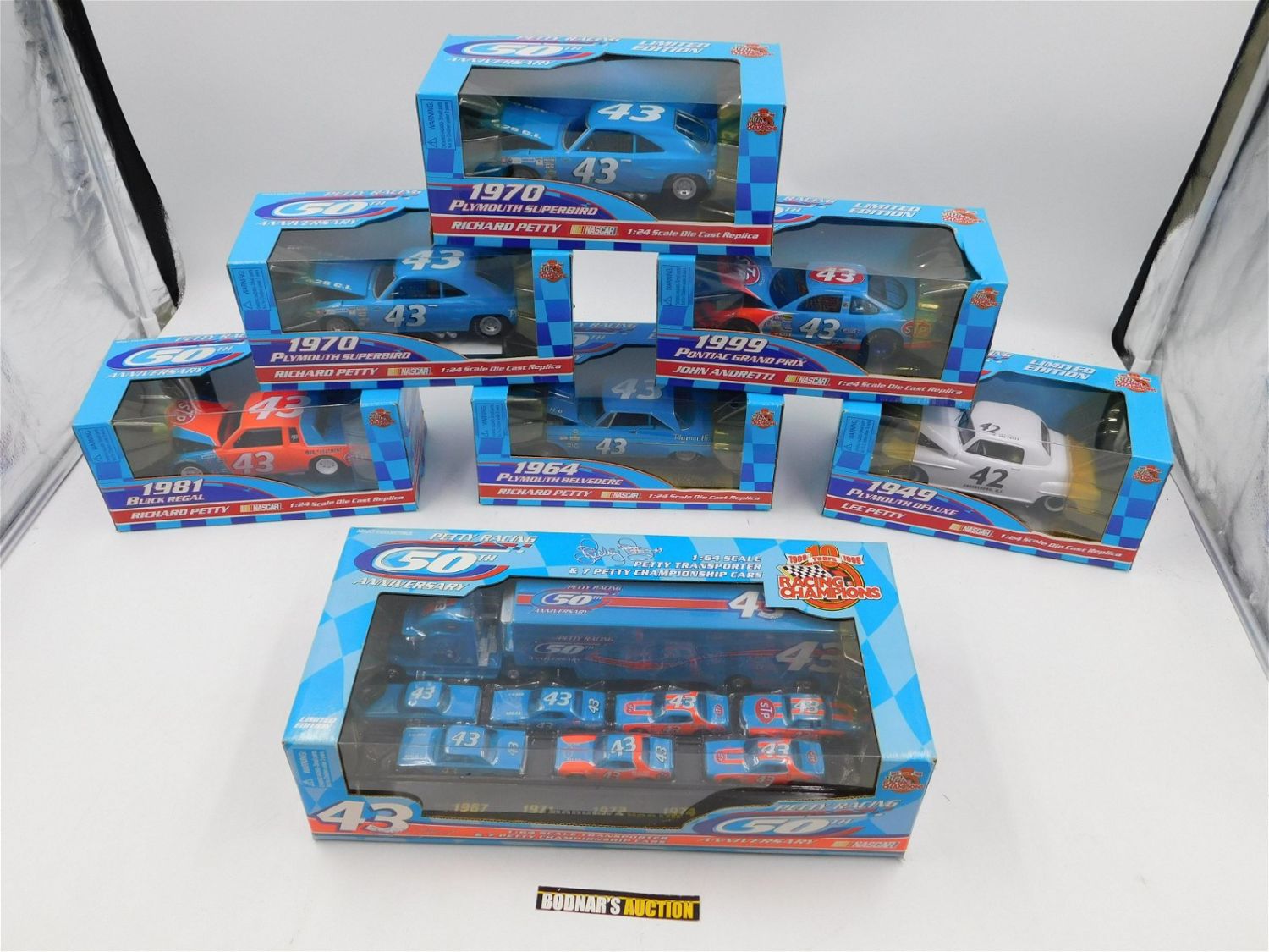 Lot of Racing Champions Petty Racing 50th Anniversary Diecast including 1:64 Scale Transporter and 7 Petty Championship Cars, and 1:24 Scale Lee Petty 1949 Plymouth, Richard Petty 1964 Plymouth Belvedere, (2) Richard Petty 1970 Plymouth Superbird, Richard Petty 1981 Buick Regal, and John Andretti 1999 Pontiac Grand Prix. All invoices must be paid within 24 hours of the sale. All items are shipped USPS or UPS and will be billed separately. A $10 handling fee is added to the shipping price per lot. Local pickups are in our South Brunswick location on Friday, Saturday and Monday ONLY! All pickups are by appointment only. Any condition issues will be listed in the description. Please read the terms for full information.