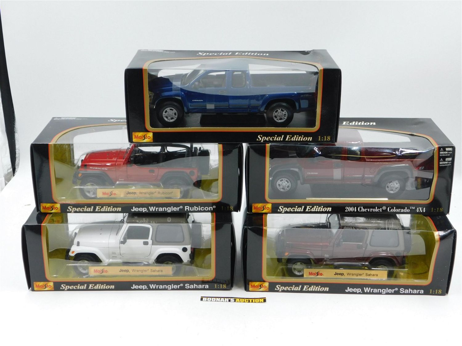 Lot of 5 Maisto Diecast Cars. Including (2) Jeep Wrangler Sahara (Maroon and White), Jeep Wrangler Rubicon, 2004 Chevrolet Colorado, and 2004 GMC Canyon. All 1:18 Scale in Original Box. All invoices must be paid within 24 hours of the sale. All items are shipped USPS or UPS and will be billed separately. A $10 handling fee is added to the shipping price per lot. Local pickups are in our South Brunswick location on Friday, Saturday and Monday ONLY! All pickups are by appointment only. Any condition issues will be listed in the description. Please read the terms for full information.